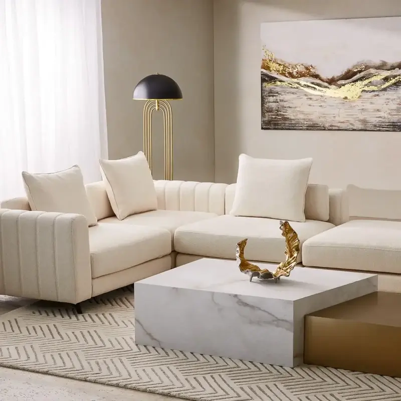 Featuring a structured silhouette inspired by the classic tuxedo sofa, it’s upholstered in soft Chantilly White fabric for a light, tailored look. This left-arm module adds both style and function to your corner configuration.