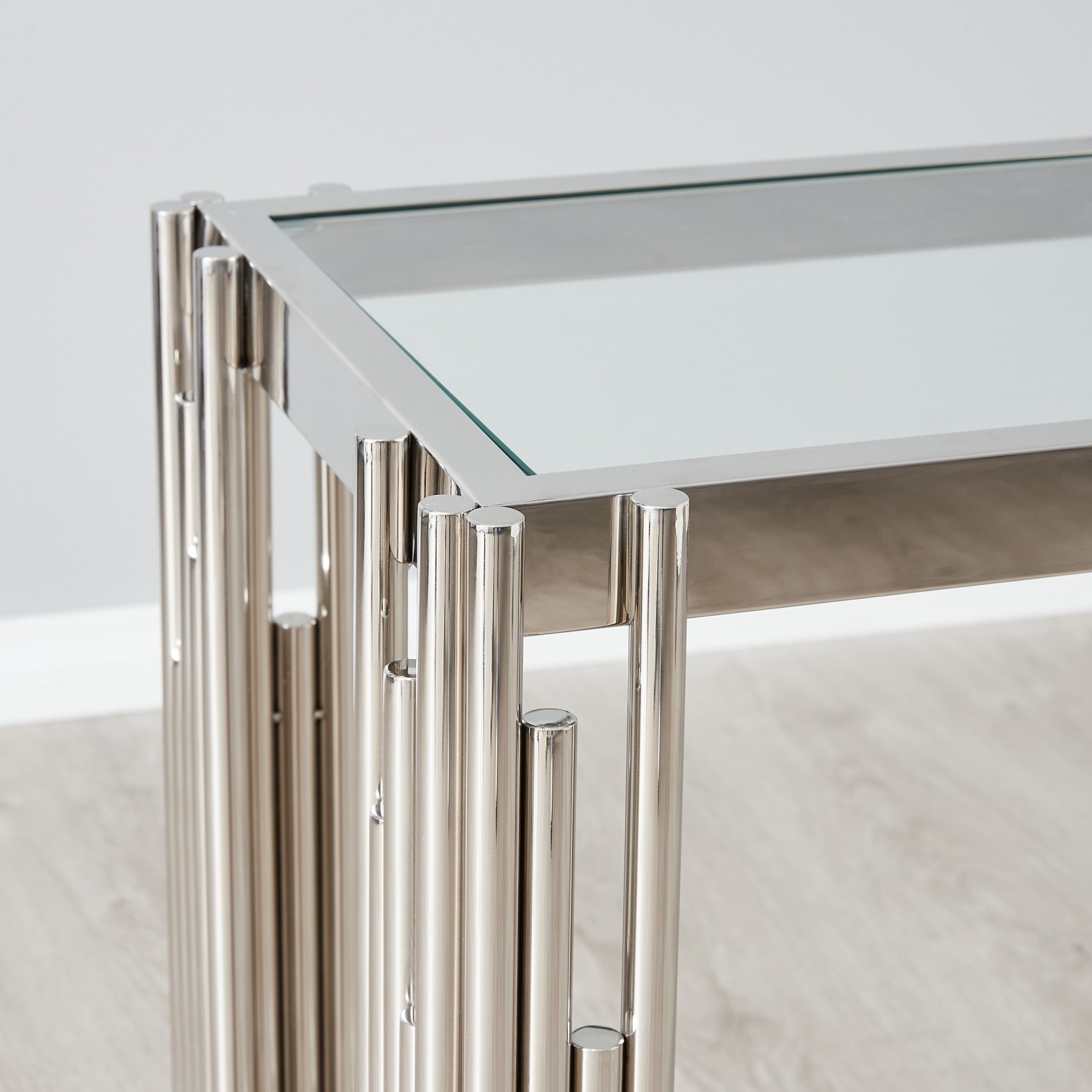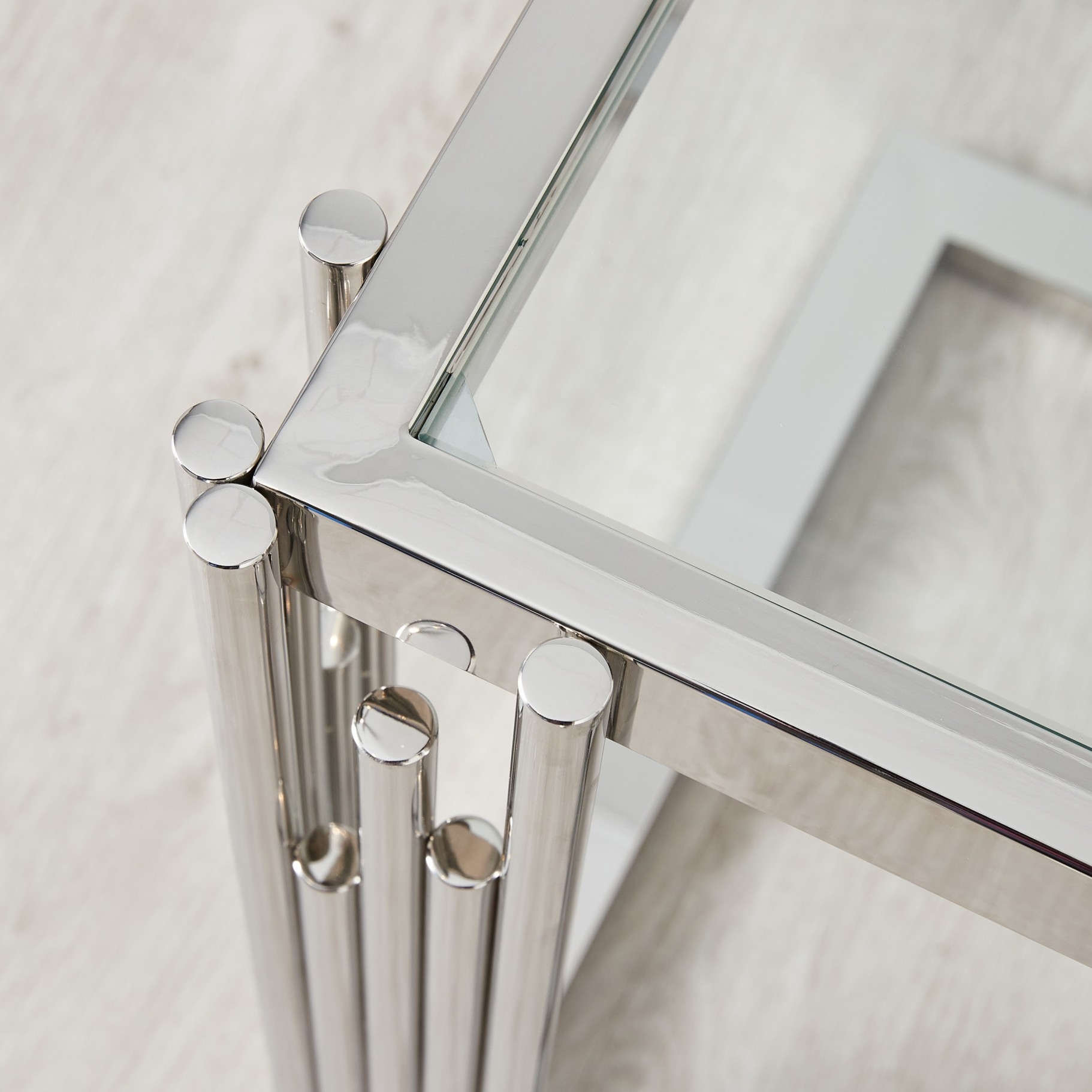 The Jules Polished Silver Stainless Steel Side Table combines a functional design with art-deco inspiration, featuring a unique frame of stainless-steel tubes. Its sleek structure makes it an ideal sofa sliding table for convenient lounging.