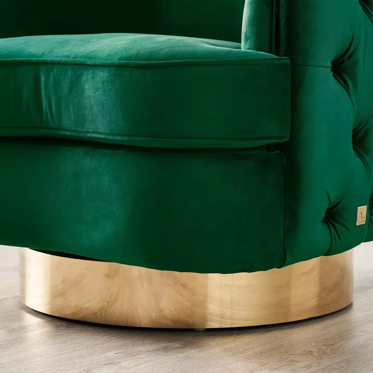 The Kelly Swivel Chair combines style with comfort, featuring a emerald velvet fabric on a well-crafted wooden frame. Hand-done button tufting adds to its plush appearance.