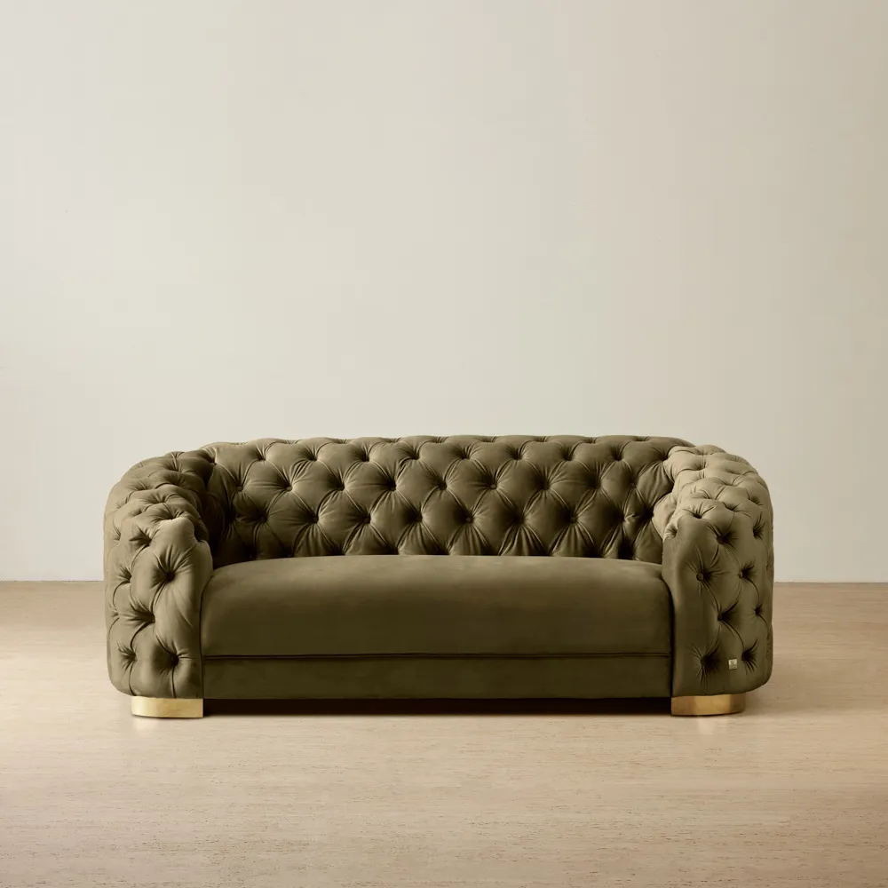The Kelly Peacock Blue Velvet 2-Seater Sofa offers an Art Deco twist on the classic Chesterfield design. It highlights its elegance with its tufted sections, draped in velvet fabric in a luxe Peacock Blue shade.