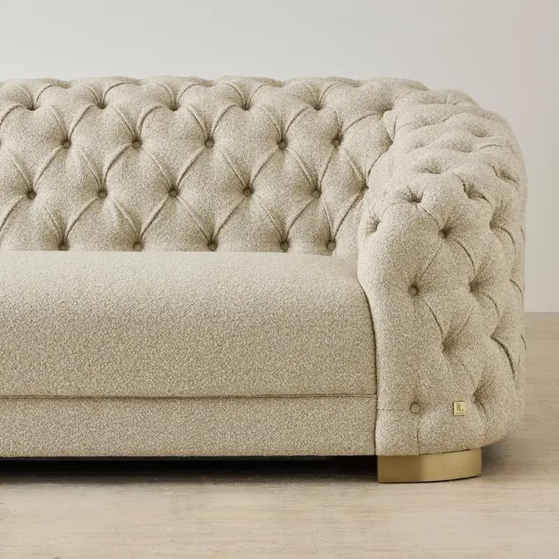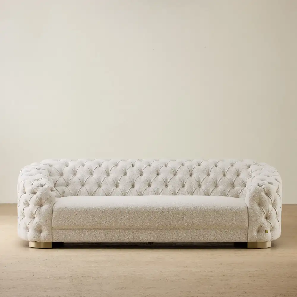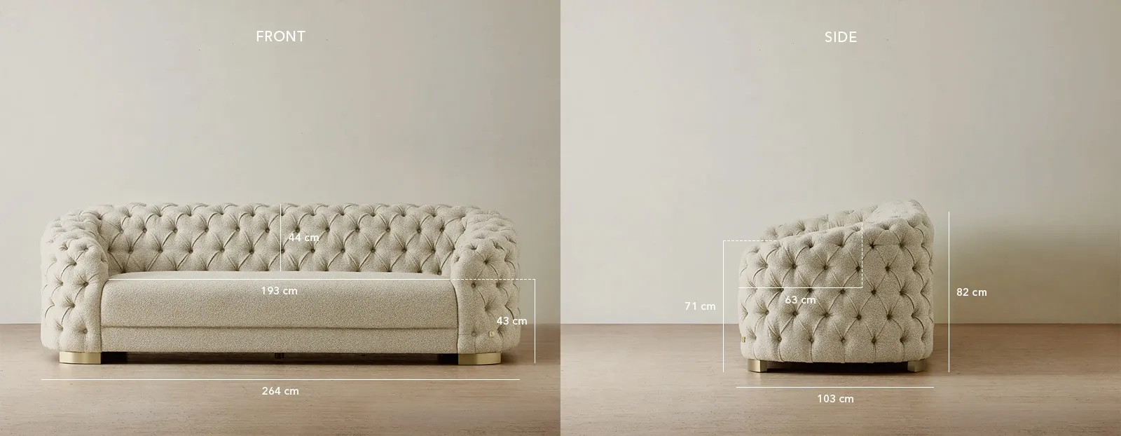 The Kelly 3-Seater Sofa showcases exquisite deep tufting that brings texture, depth, and a sense of timelessness. Its sculpted curves flow gracefully from arm to back, creating a beautifully balanced silhouette that feels both classic and contemporary.