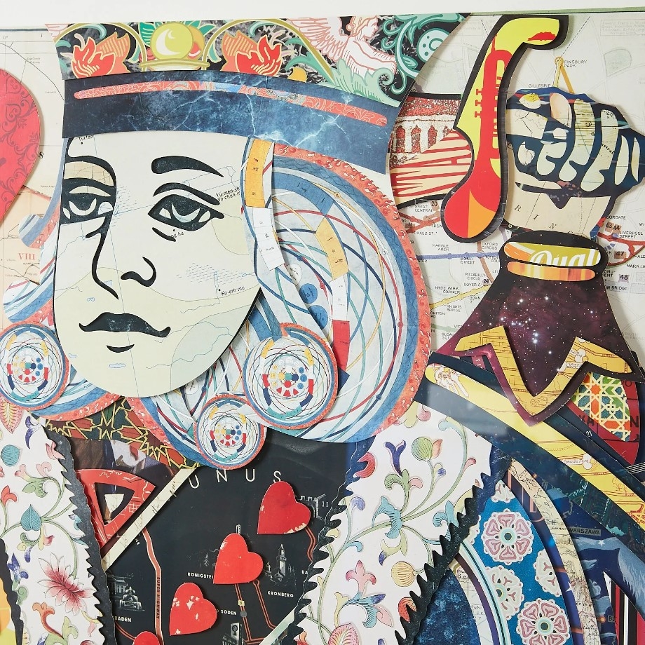 The rich palette and imaginative design breathe new life into the stoic King, revealing a tapestry of stories hidden within the well-known lines of his visage. Placed alongside its equally enchanting counterpart, the Queen of Hearts Paper Collage, the duo creates a symphony of regal romance and modern artistry.