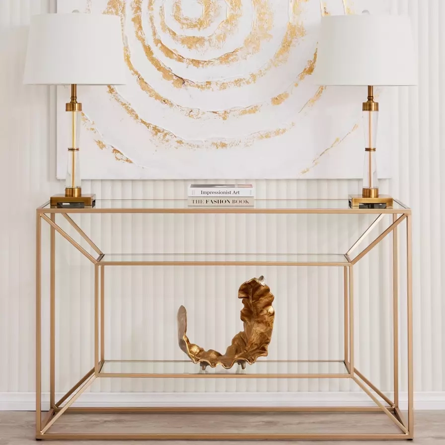 A distinct air of elegance permeates throughout our beautiful Golden Laila Glass Console Table. It aims to dazzle you with its artistically designed frame that's both a nod to classic looks and modern minimalism. The Laila Console Table presents a masterfully crafted geometric frame with an open design that allows light and the beauty of your other pieces to shine through. The Laila plays with light and space to add intrigue to your home.
