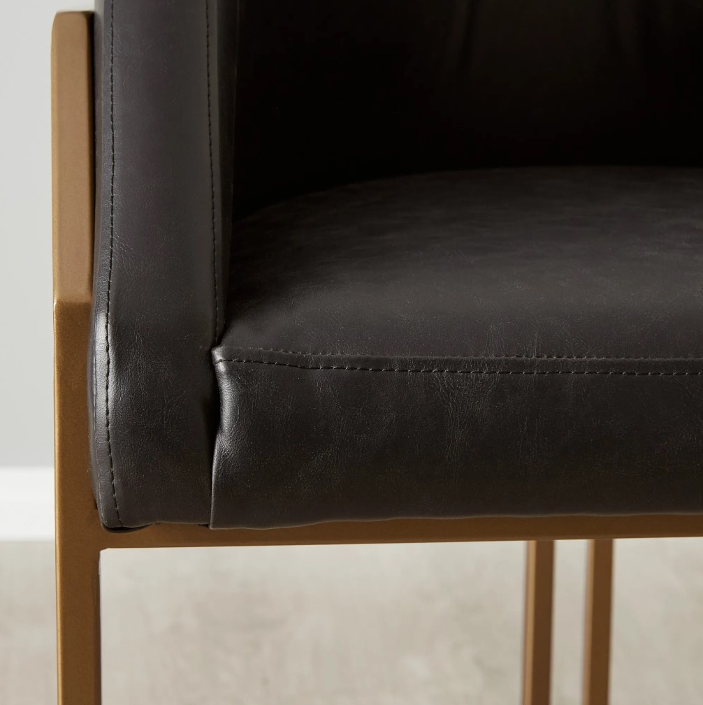 The Sleek Black hue of the leather enhances the chair's luxurious aesthetic, radiating sophistication. Sink into the plush seat and feel the embrace of the smooth and luxurious material. A sturdy metal frame in a brass-coloured finish envelops the seat, adding a touch of sophistication and visual interest. The slender design of the leg frame exudes a sense of lightness and grace, while the brass colour lends an element of timeless charm.