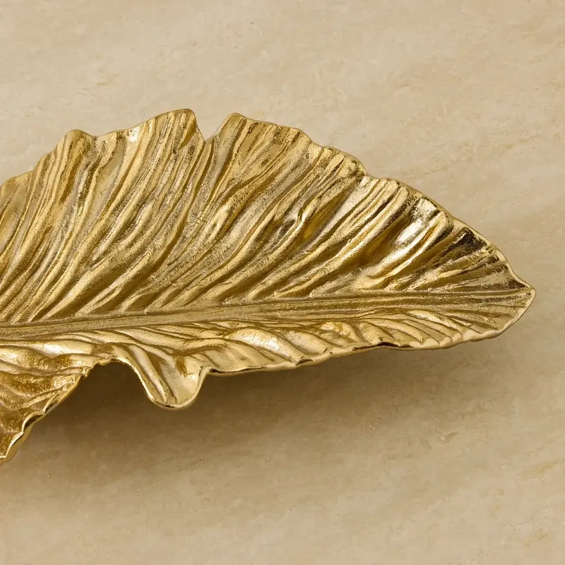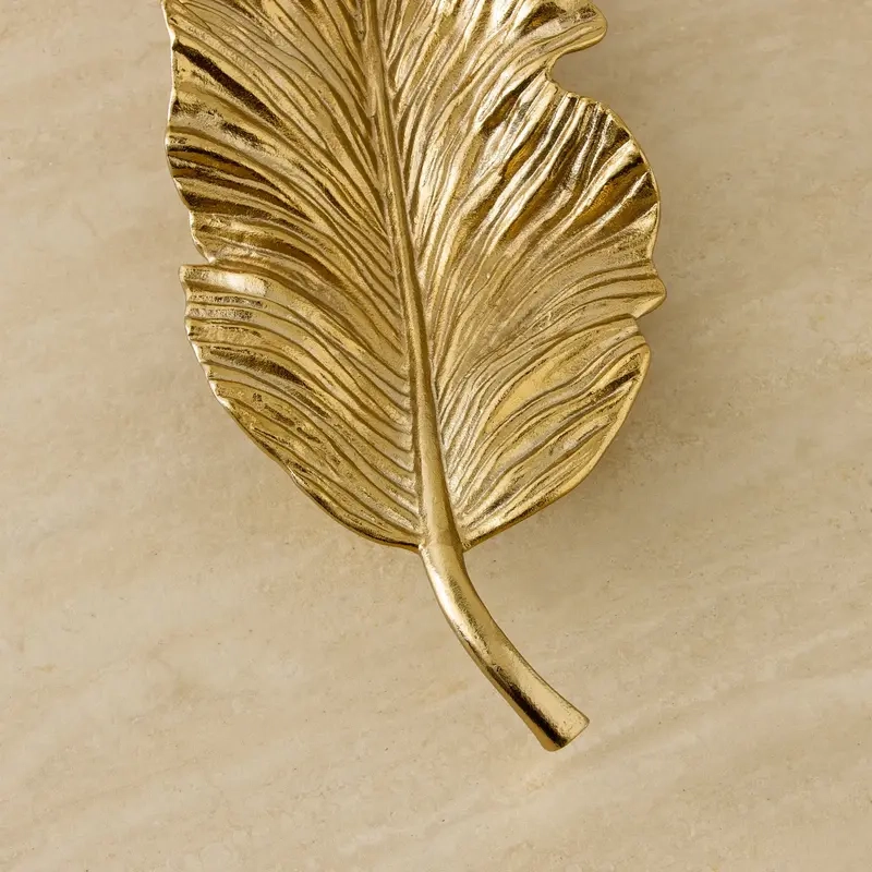 The Leaf Brass Platter II captures the organic grace of a leaf in radiant brass form, its textured veins and curved edges creating a striking interplay of light and shadow.