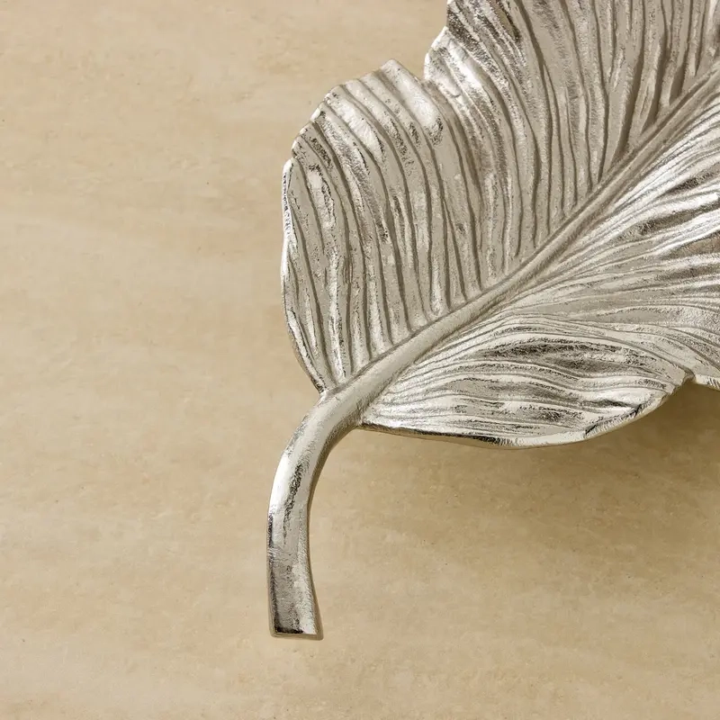 The Leaf Nickel Platter II captures the organic grace of a leaf in gleaming metal form, its textured veins and curved edges creating a striking interplay of light and shadow.