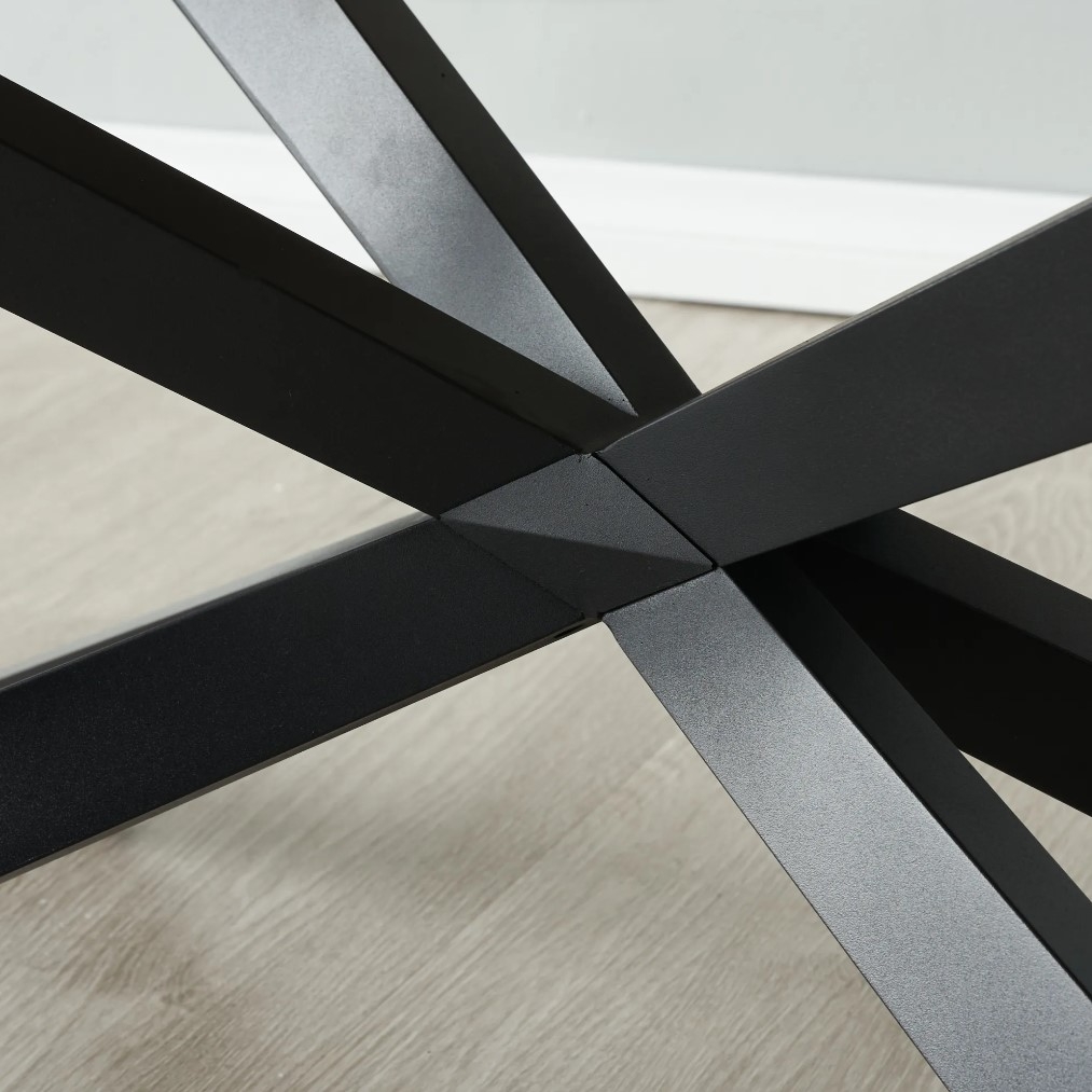 It features a spacious sintered stone tabletop supported by black stainless steel legs in a striking geometric design. Ideal for decor, books, or gatherings, it pairs well with sofas and a stylish rug for a cohesive living room look.
