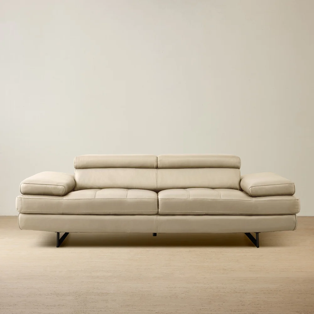 The Lennox Almond Cream Leather 2-Seater Sofa brings modern luxury to your living room with its comfortable seats and contemporary features, highlighted by its genuine leather upholstery.