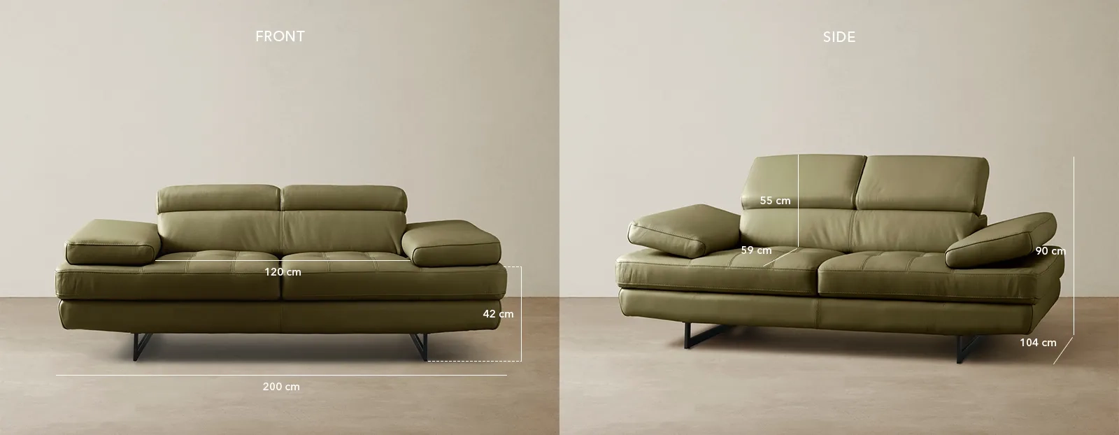 The adjustable headrests offer personalised comfort, while the wide seats filled with high-density foam provide optimal relaxation. Black legs add a sleek contrast, completing the contemporary look of the sofa.