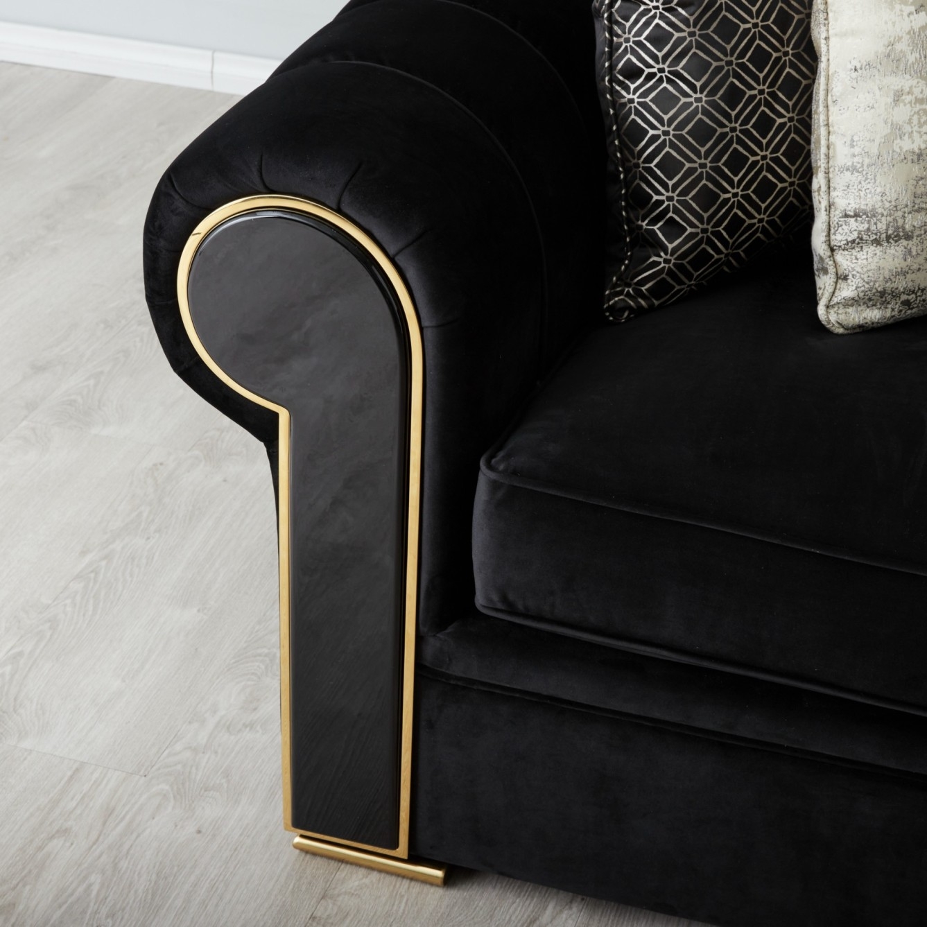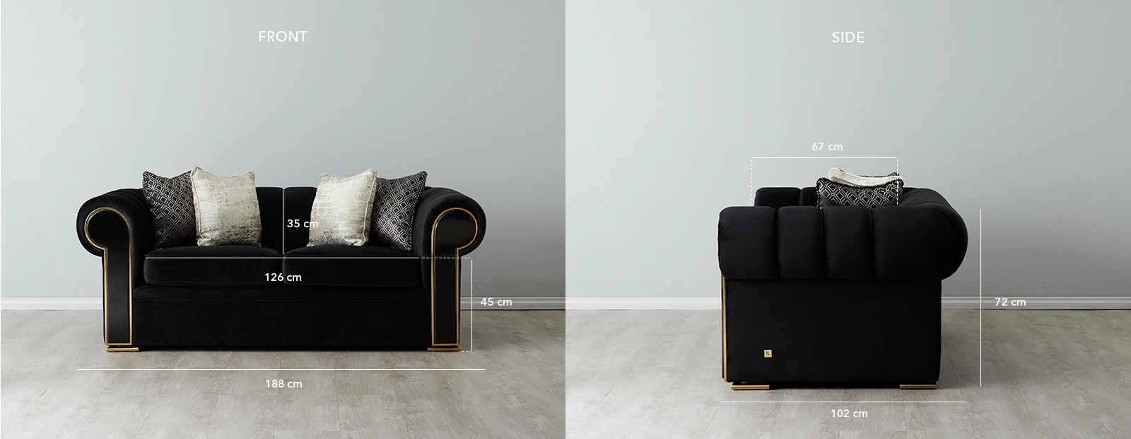The Leola 2-Seater Sofa brings art deco style to modern times with its timeless design and impressive colors. The Leola is upholstered in black velvet fabric giving it a look of decadence.