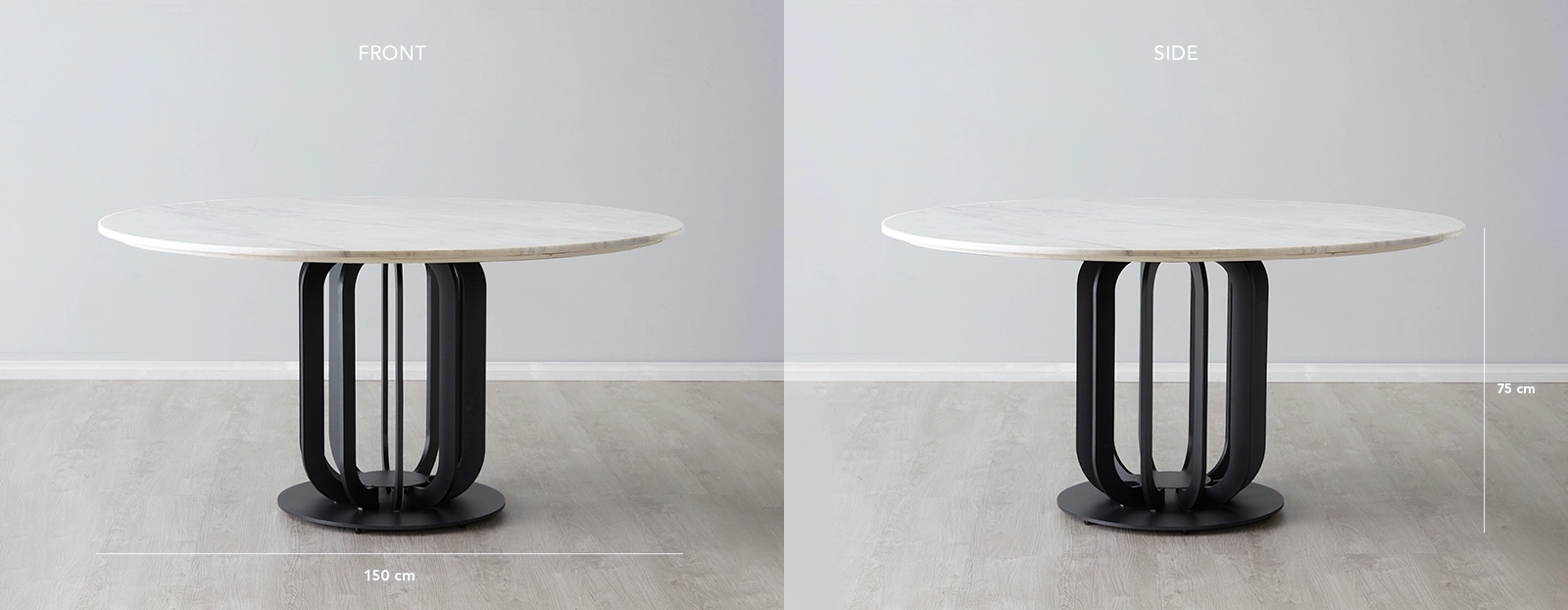 This stunning surface serves as the perfect stage for banquets and get-togethers, inviting your guests to indulge in culinary delights and engage in lively conversations. The Lillian's impressive powder-coated iron base is a work of art in itself. With elegant lines and open spaces, the base not only provides sturdy support but also adds a sculptural element to the table's design. Designed to accommodate gatherings of various sizes, the Lillian comfortably seats 5-6 people, ensuring ample space for everyone to enjoy a shared dining experience.