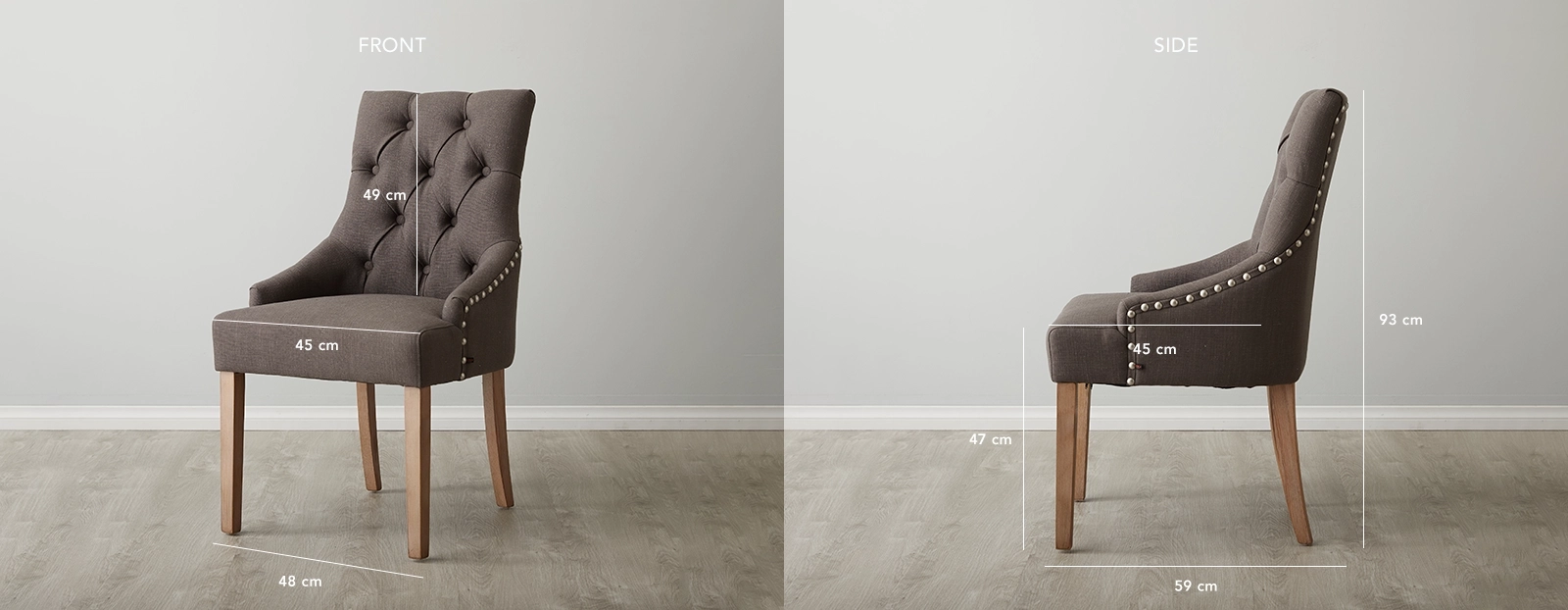 Accentuating the chair's silhouette is the row of silver studs, which outlines the contours of the chair with precision and adds a touch of opulence. This intricate detailing adds depth and character to the Linda Dining Chair, elevating its formal look and creating a sense of refinement. The dark stained pinewood legs further contribute to the chair's elegance, providing a sturdy and durable foundation. The rich, deep colour of the legs complements the neutral tone of the upholstery, creating a harmonious and balanced visual composition.