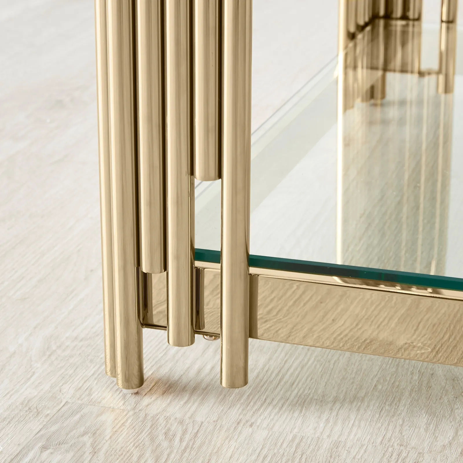 The Lindsay Coffee Table features stainless steel tubes at each corner, adding a unique and glamorous touch to your space. A lower section provides extra storage to keep your living room organized and clutter-free.