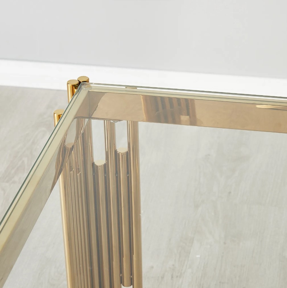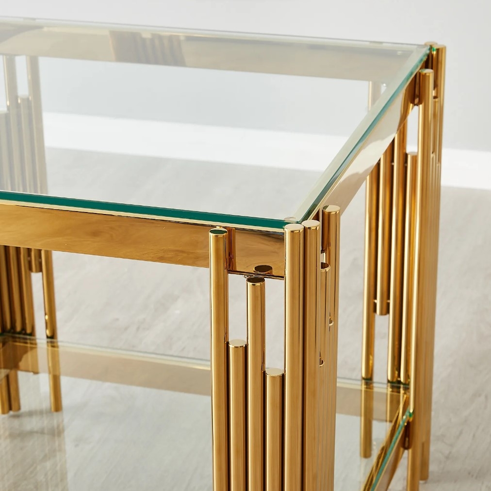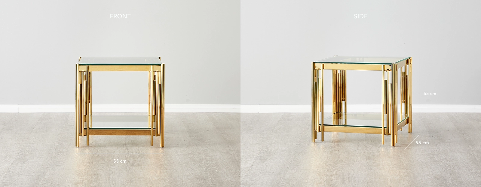 Add Golden lustre to your home with our one-of-a-kind Lindsay Polished Gold Side Table. It features a masterfully crafted stainless steel frame with a compact square-shaped design and is filled with fine details. Offering a wealth of utility is its spacious tabletop, made from a gorgeous cut of tempered glass. Fill the Lindsay's top surface with your decorations, books and more. It also helps to keep your essentials within arm's reach.