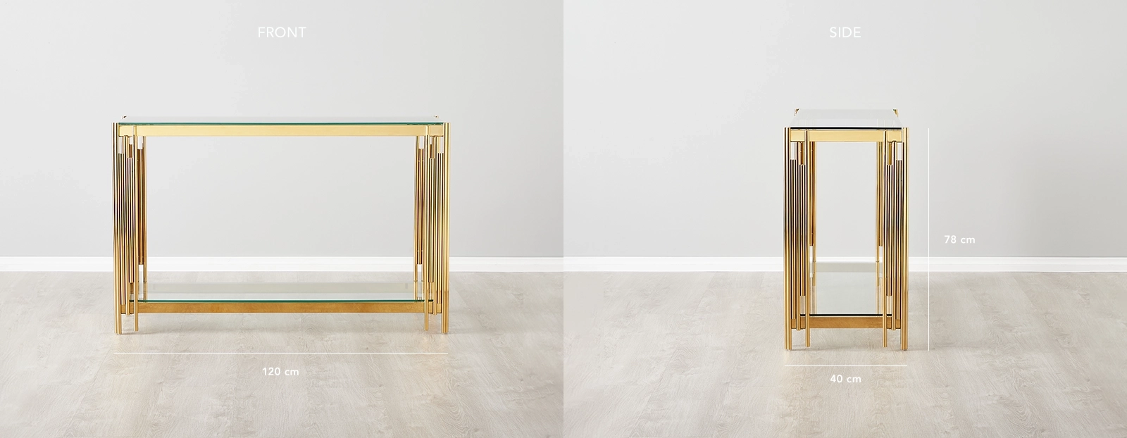 Add Golden lustre to your home with our one-of-a-kind Lindsay Polished Gold Console Table. It features a masterfully crafted stainless-steel frame in a bold rectangular design and is filled with fine details. Offering a wealth of utility is its spacious tabletop, made from a gorgeous cut of tempered glass. Fill the Lindsay's top surface with your decorations, figurines, and more.