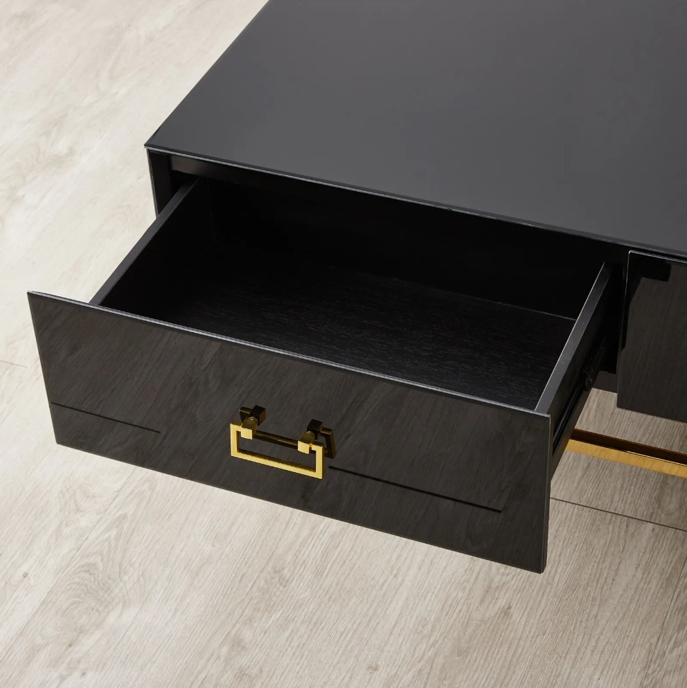 The Luella Black Coffee Table combines black and gold accents, making it a striking centerpiece for any room. With four drawers, it offers ample storage and a stylish surface for decor, adding both elegance and functionality to your space.