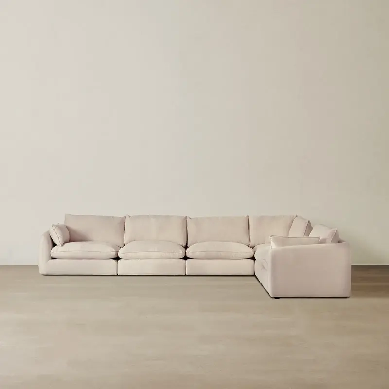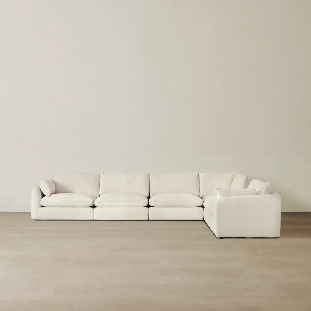 The configuration seats up to five, including a corner section that extends the layout. Each piece connects seamlessly with the rest of the Macie Lite collection for a balanced modular setup.