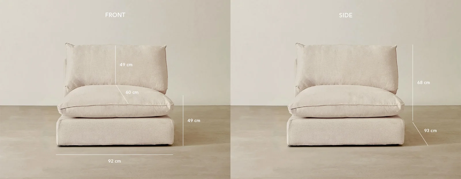 Plush cushioning and soft fabric create an easy, relaxed feel that suits any modern space. Its armless design adds flexibility, letting you shape your seating to fit your room perfectly.