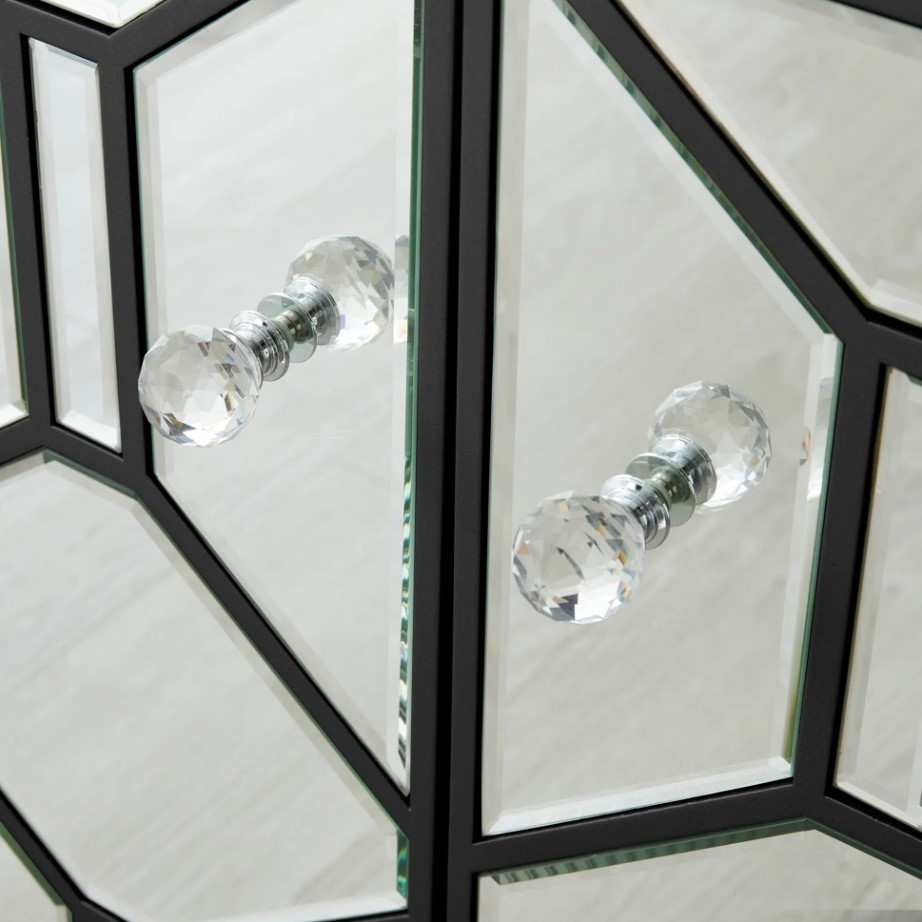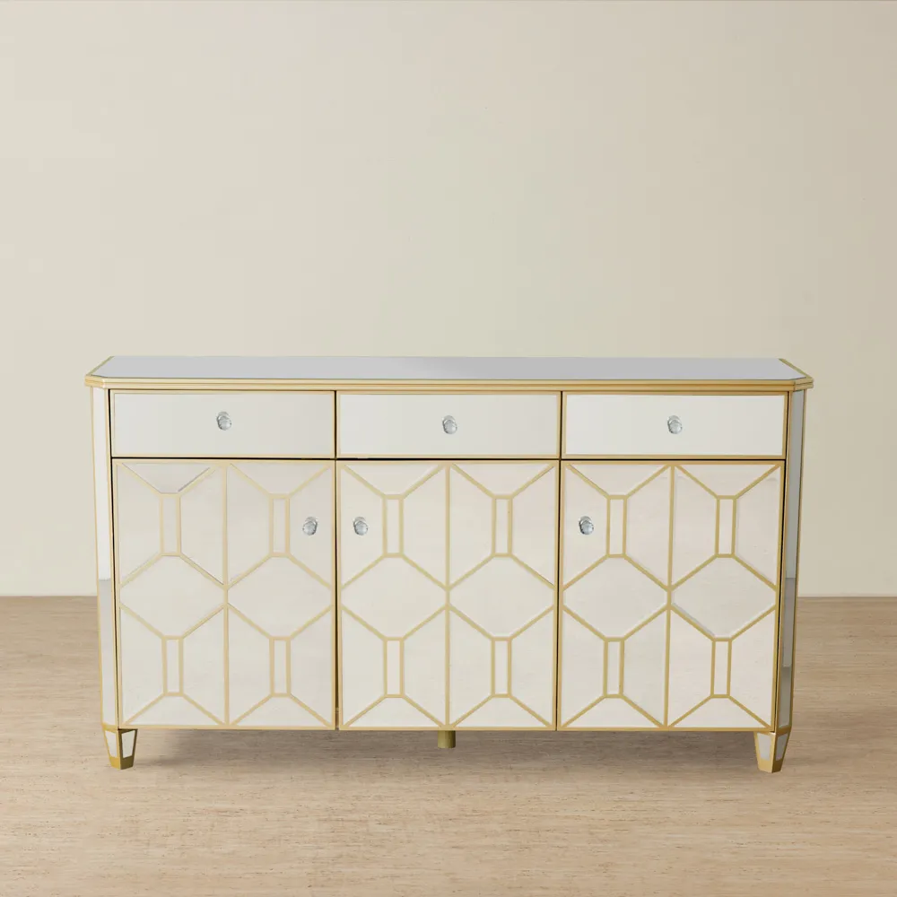 The Madeleine Sideboard is a mesmerizing piece that immediately captures the imagination. It is made with high-quality materials expertly crafted to create a functional work of art. A beautiful array of elegantly designed mirrors decorate the top, sides and front of the piece. These gorgeous panels are fashioned in an awe-inspiring geometric pattern reminiscent of vintage art-deco style.