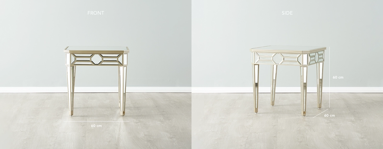 It features a spacious mirrored tabletop that further glamourizes your various keepsakes, books and essentials. The Madeleine's gorgeous outline is emphasized by its delectable display of champagne gold colours. The Madeleine's four legs are also panelled with mirrors to further increase its stylish appeal. Breathe new life into your space as you let it shine in splendour with the Madeleine Mirror Side Table. Pair the Madeleine with one of our majestic sofas and floor rugs.