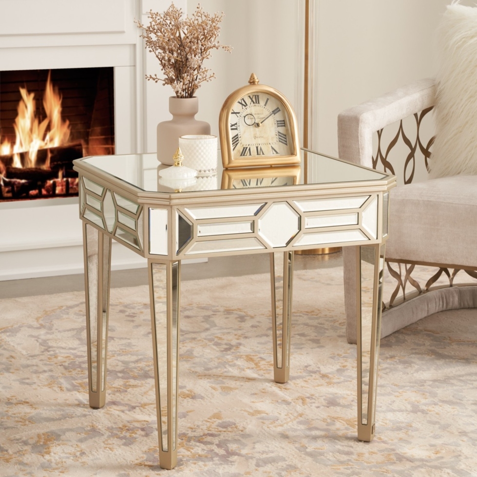 The Madeleine Mirror Side Table aims to delight and shine new light into your home with its creative design and classic aesthetic. A beautiful array of elegantly designed mirrors ornament its entirety and are fashioned in an awe-inspiring geometric pattern reminiscent of vintage art-deco style. The Madeleine effortlessly adds stylish boldness to your space that is unapologetically luxurious from every angle.