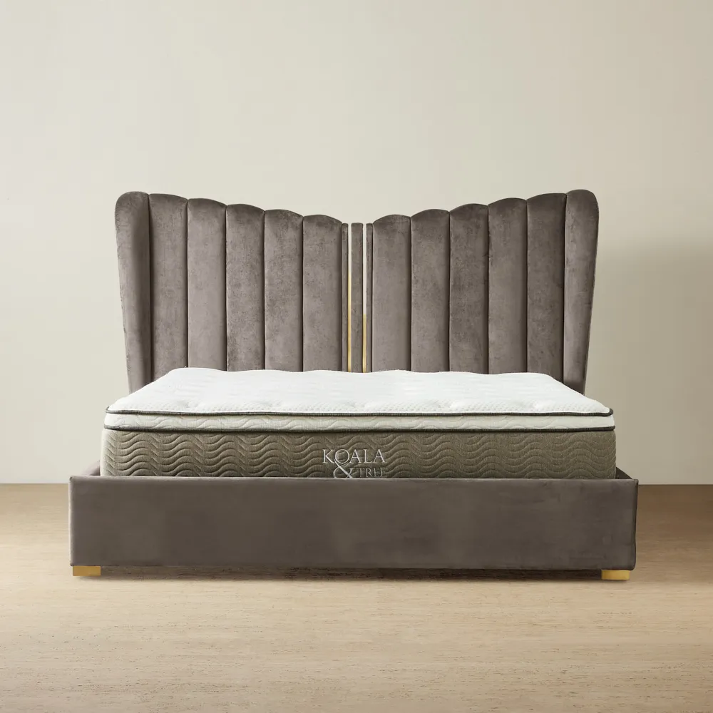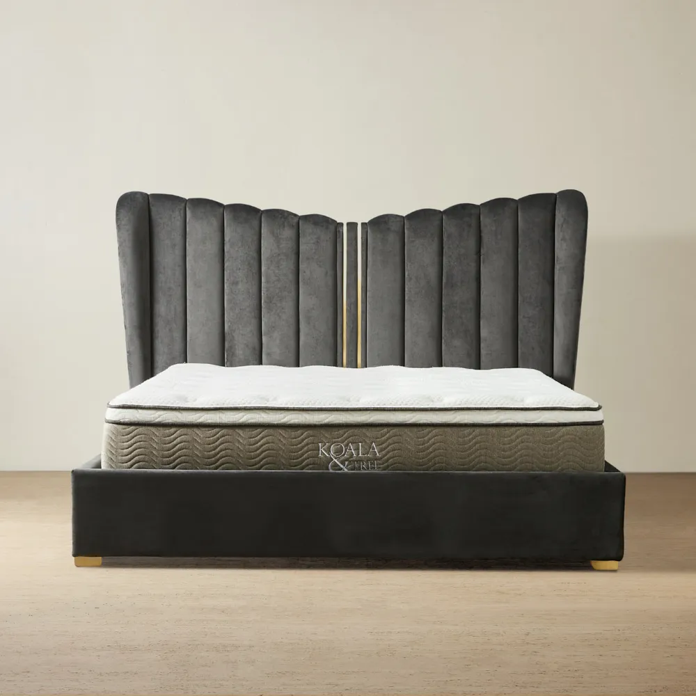 The Madrid King Bed brings a sense of majesty to your bedroom with its elegant cream velvet upholstery and regal wing-inspired headboard. The soft, lustrous fabric enhances its luxurious feel, creating a refined and inviting space.