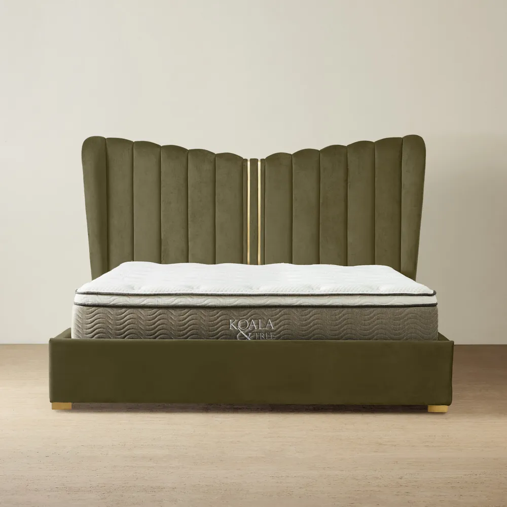The Madrid Queen Bed brings a sense of majesty to your bedroom with its elegant cream velvet upholstery and regal wing-inspired headboard. The soft, lustrous fabric enhances its luxurious feel, creating a refined and inviting space.