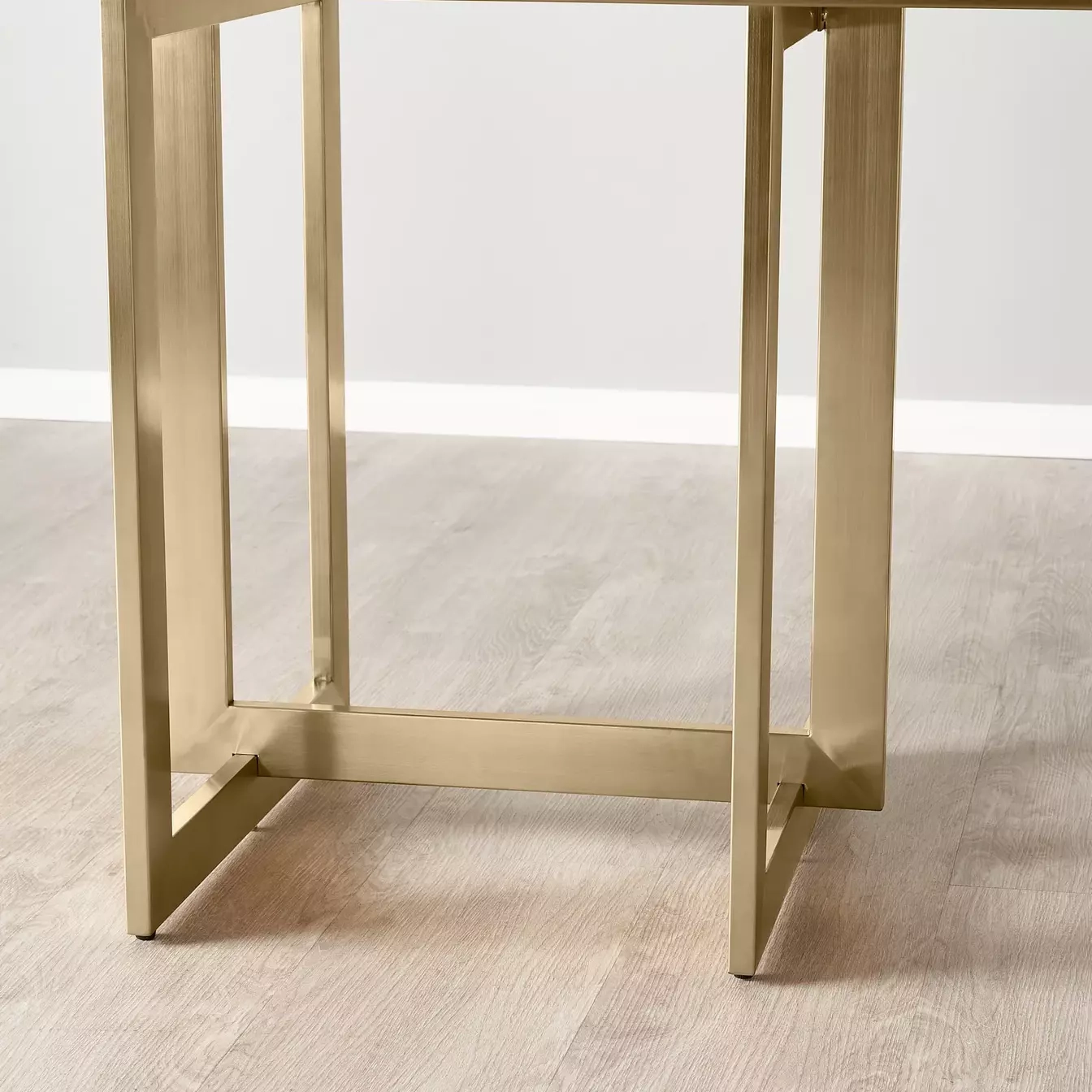 The Maia Dining Table combines sleek modernity with elegance, featuring a minimalist white stone top patterned with subtle veins and supported by gold stainless steel legs for a touch of luxury.
