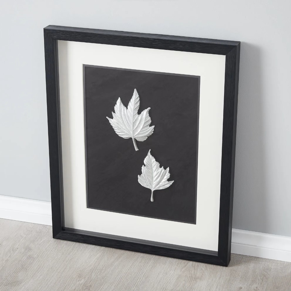 The Maple Silver Leaf Shadow Box elegantly captures nature's beauty with a modern twist. Encased within a sleek black frame, two lustrous silver leaves shine brilliantly, reflecting the intricate details of their organic counterparts. Their metallic sheen contrasts starkly against the frame, bringing a contemporary vibe to traditional design.