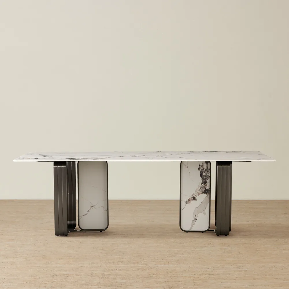 The Marbella 2-Layered Cold Calacatta White Sintered Stone Coffee Table combines ultra-modern design with practical elegance. Its radiant Calacatta sintered stone top, with unique veining, is paired with a striking black nickel frame, creating a captivating centrepiece.