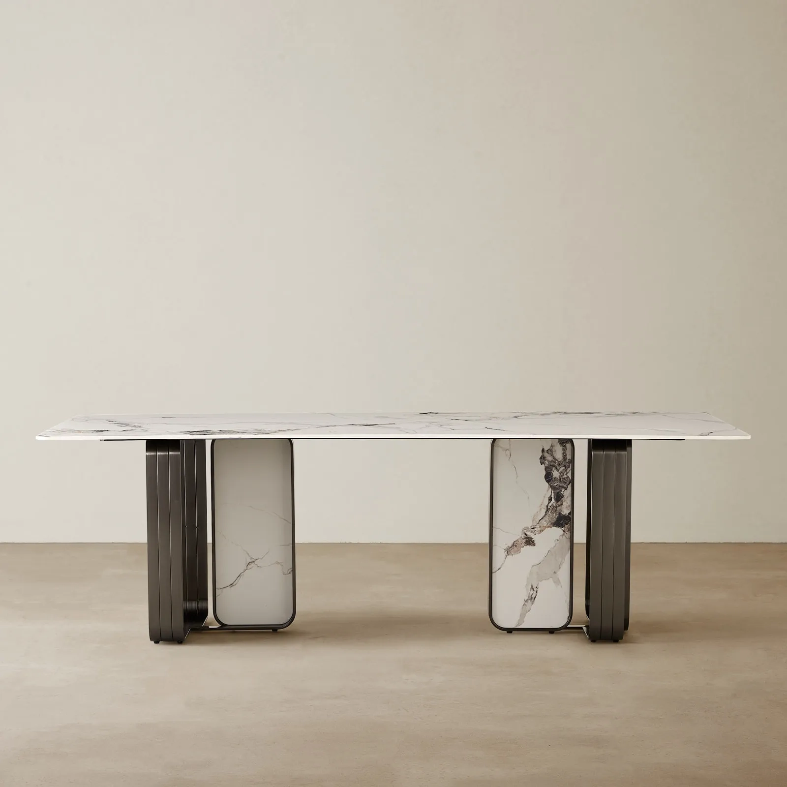 The table stands on a foundation that speaks volumes of understated luxury. Bold black nickel frames serve as the table's pillars, their subtle sheen a contemporary nod to refinement. These frames are interspersed with panels echoing the tabletop's Calacatta stone, marrying the cool white of the stone with the deep, rich allure of the black nickel. This interplay of color and texture transforms every dining experience into a memorable event, ensuring that whether it’s a casual family meal or a grand dinner party, the Marbella table is the sophisticated anchor that brings people together.