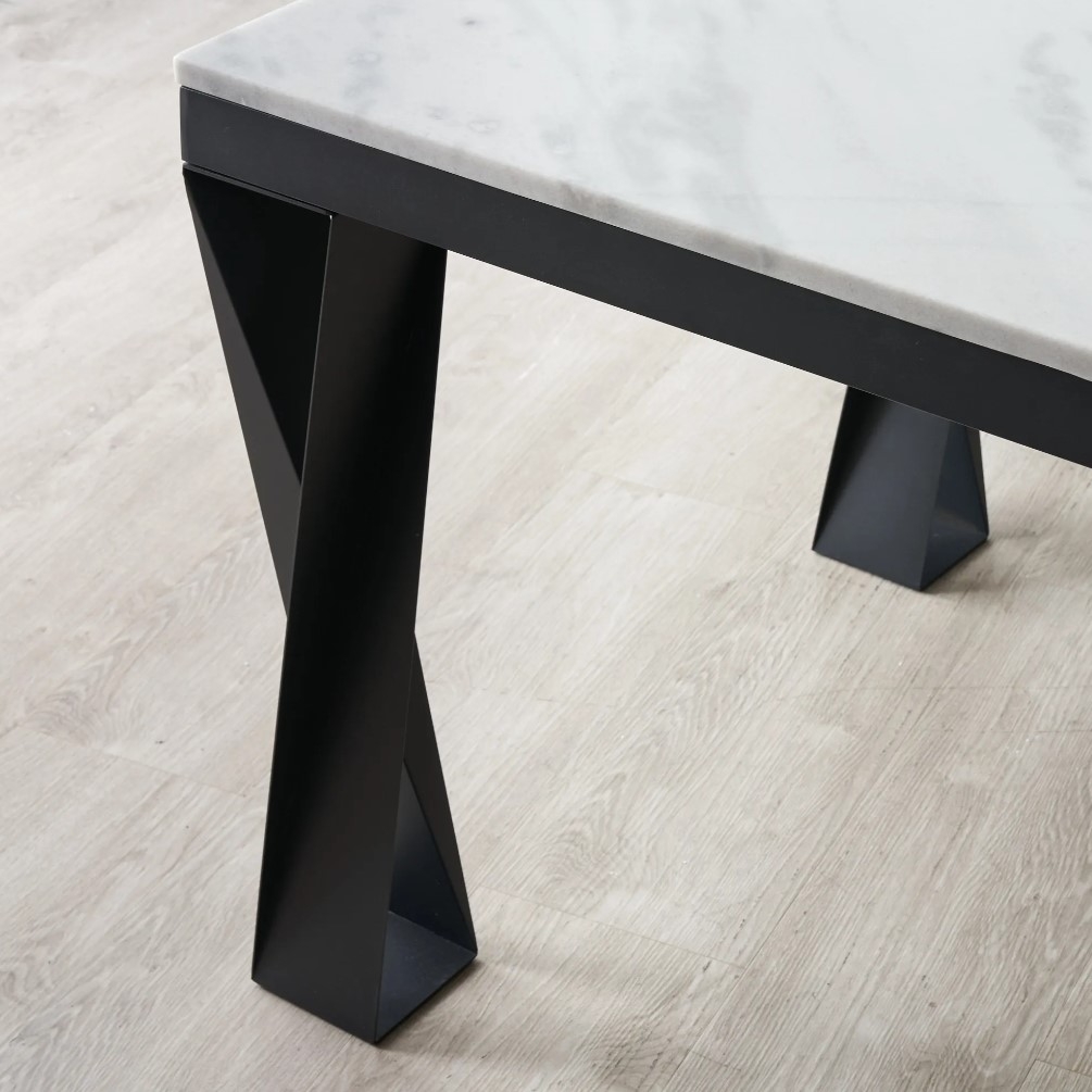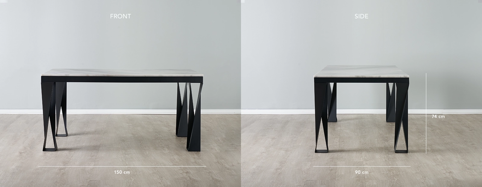 Providing stability are two pairs of stainless steel table legs that also offer a wealth of intrigue with their dynamic spiral design. The combination of Luxurious marble with its sleek legs will enhance your home dining experience. This 150cm variant is perfect for more intimate spaces. Pair with an ensemble of our gorgeous dining chairs for a truly stunning spread.