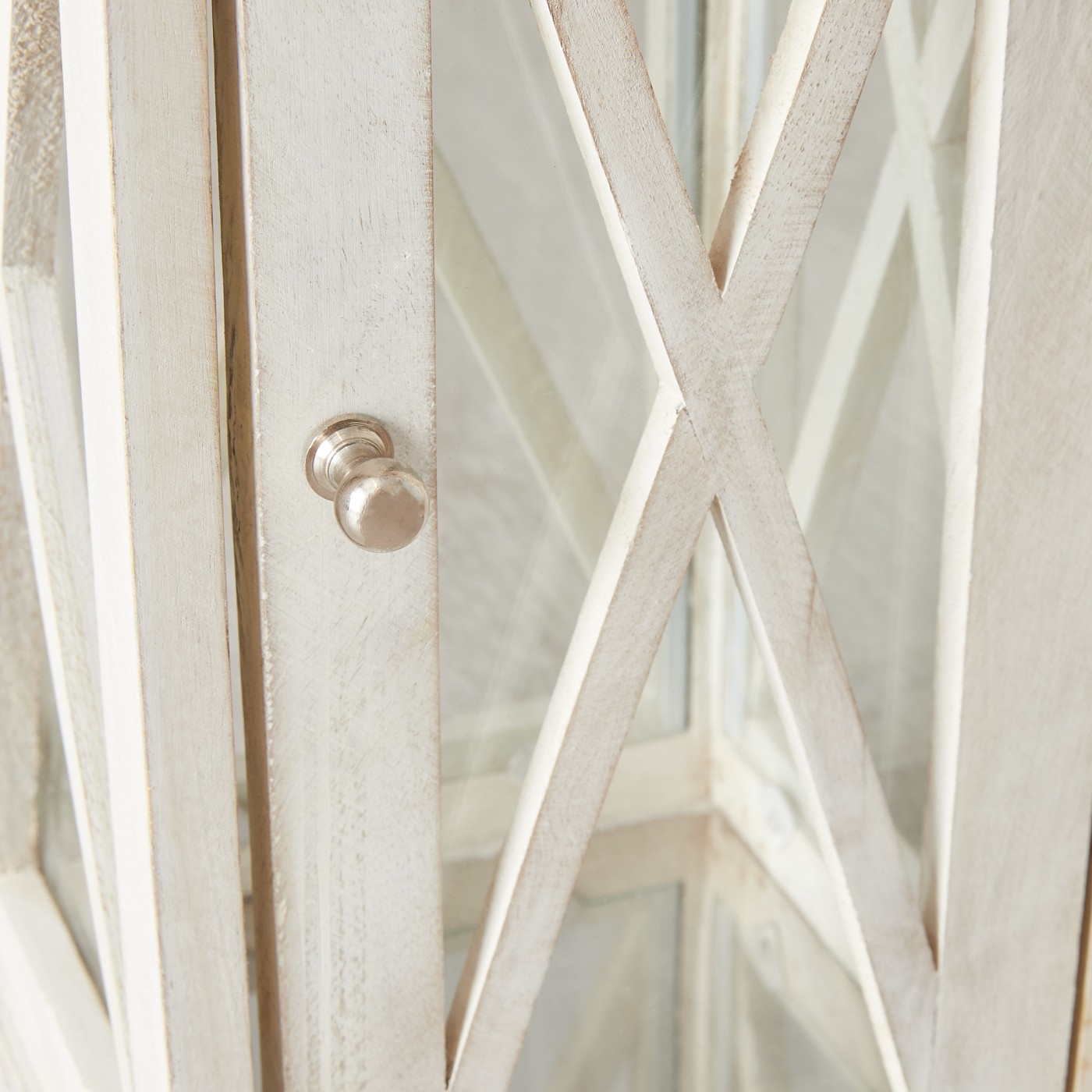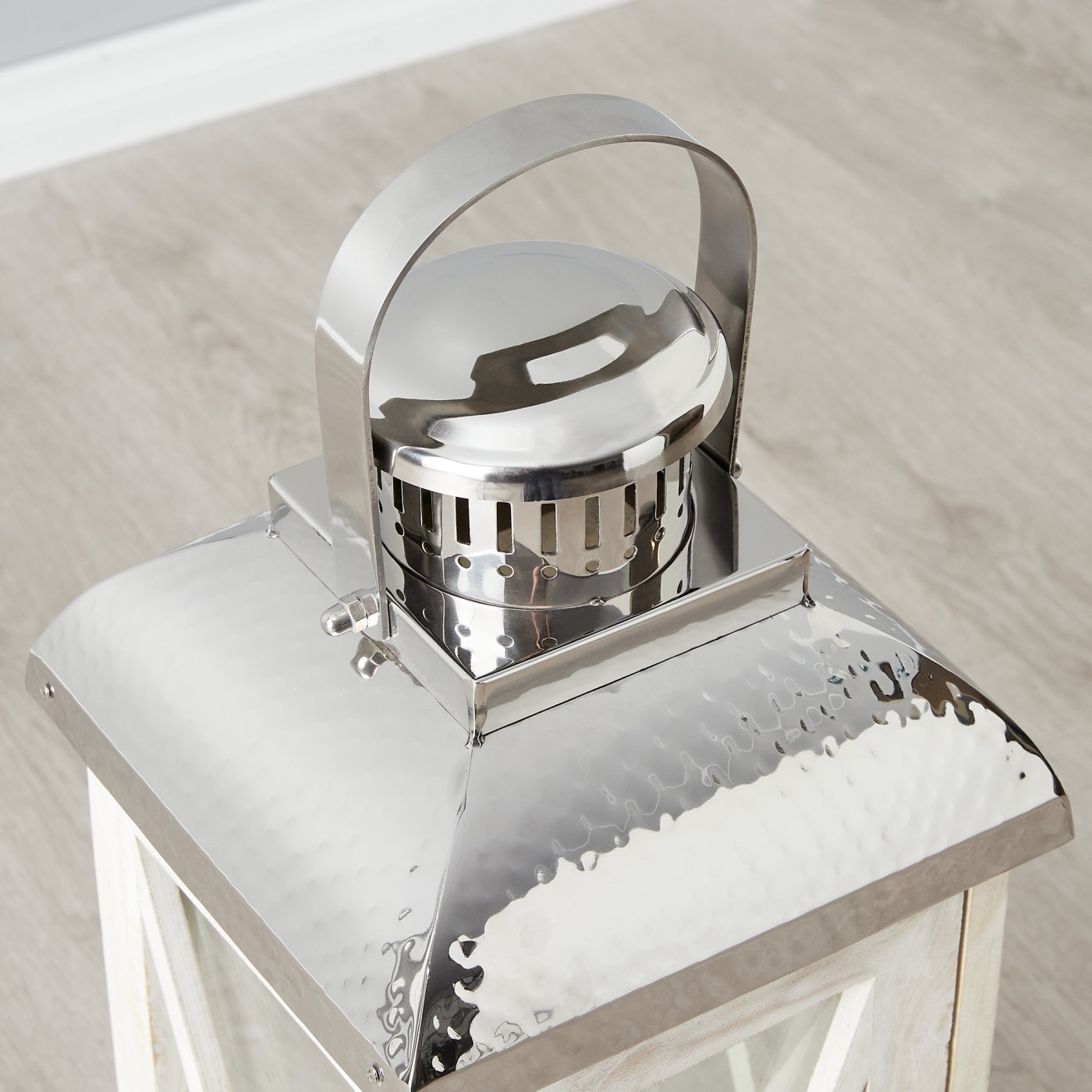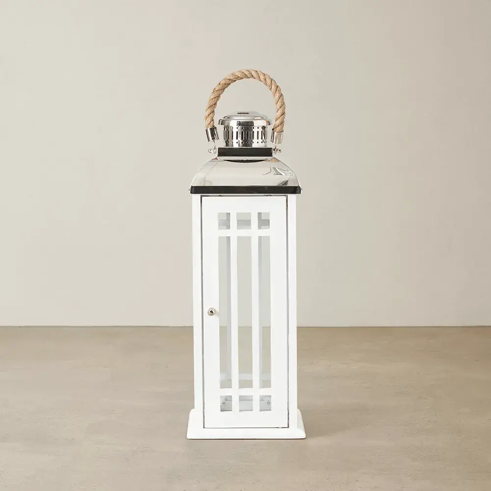 The Maximoff's clear glass borders allow light to effortlessly pass through. Protecting the clear glass while adding to its french provincial charm are thin crossing panels. The Roof of the lantern features an exhaust that also boasts a luxurious silver shade. The handle itself is a work of art and is securely fastened to allow you to carry the lantern to any room around your home. The Maximoff Whitewashed Wooden Lantern comes in large and small-sized variants.