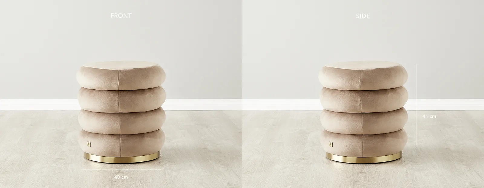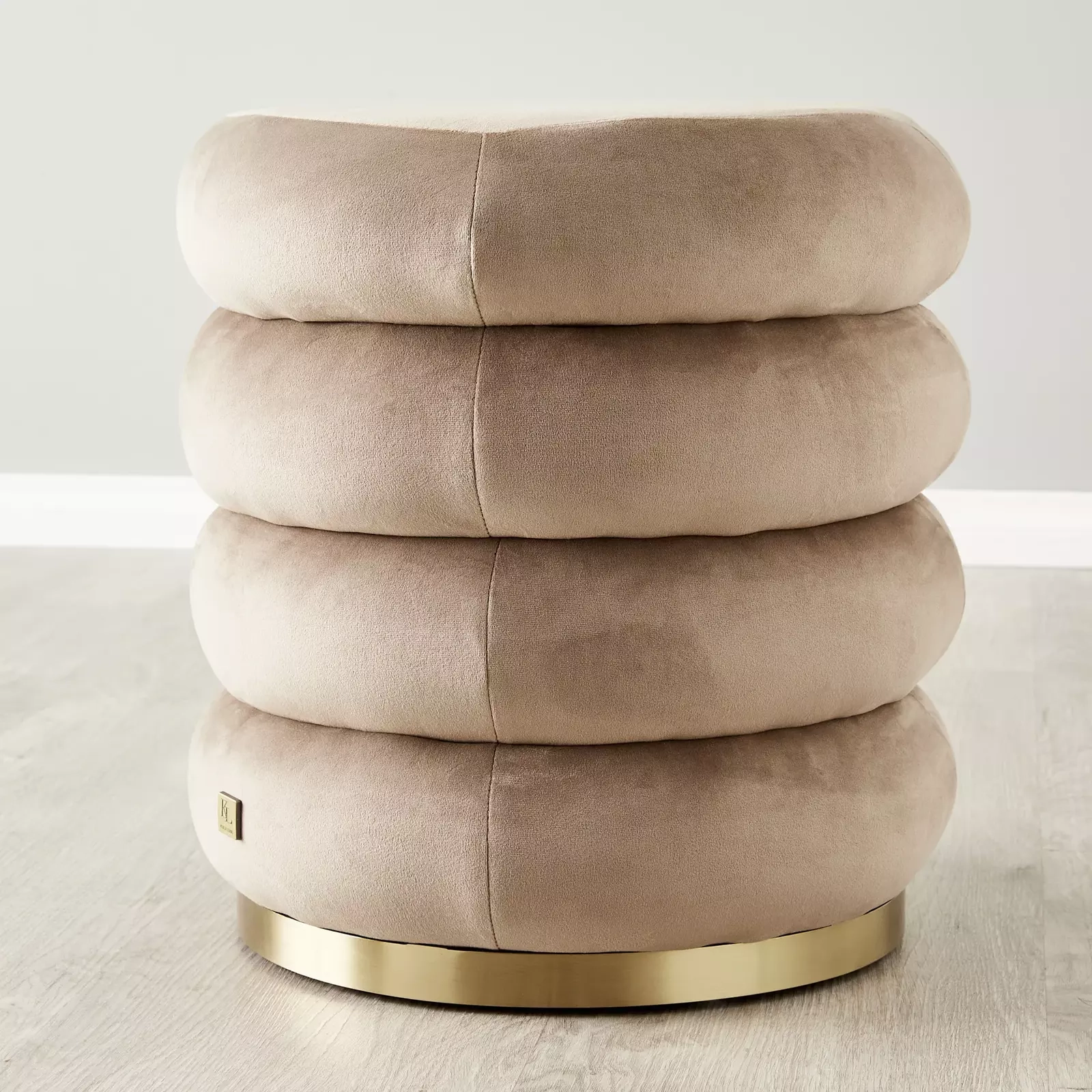The Megan Beige Velvet Ottoman exudes contemporary charm with its layered, rounded form, offering a modern twist on classic luxury. Each tier of plush velvet invites a touch, layered like a sumptuous cake, and the beige hue adds a subtle, on-trend, yet timeless appeal that can complement a variety of palettes. This ottoman's style is crowned by a lustrous, brass-colored band that encircles its base, providing a chic metallic contrast that truly makes the piece pop.
