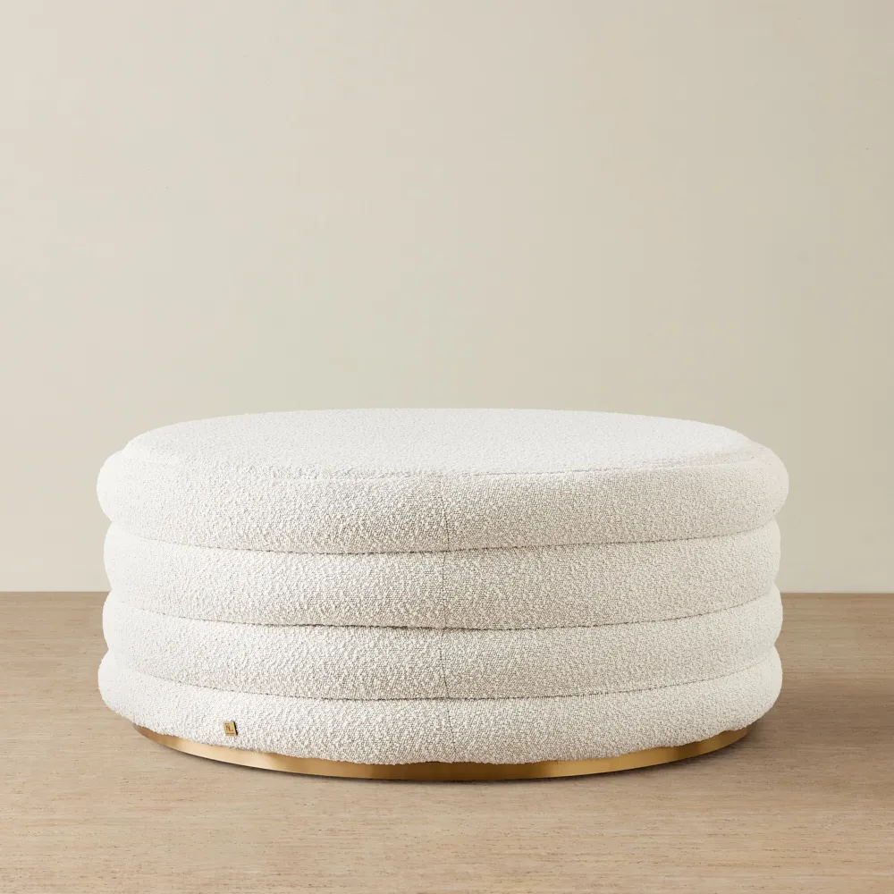 The Megan Ottoman is wrapped in beautiful cream-colored velvet fabric with a plush surface, adding both comfort and aesthetic appeal to the piece.