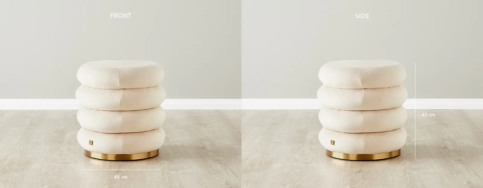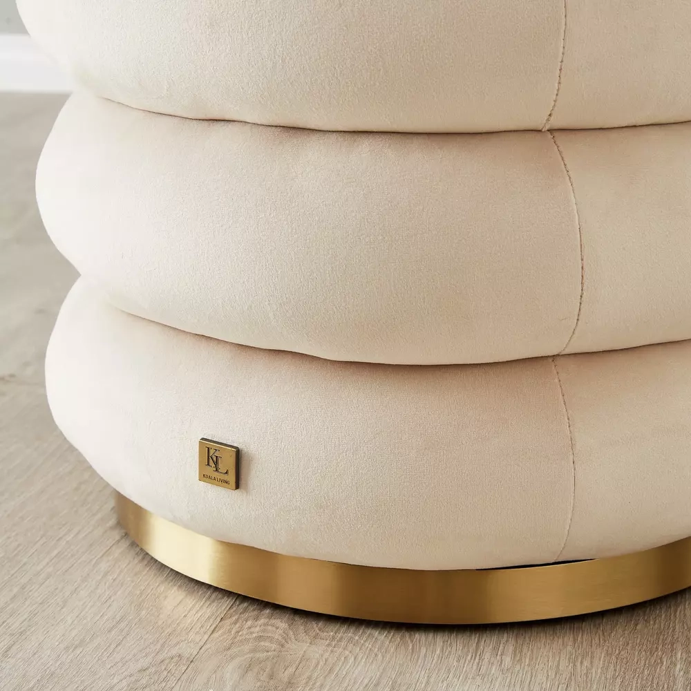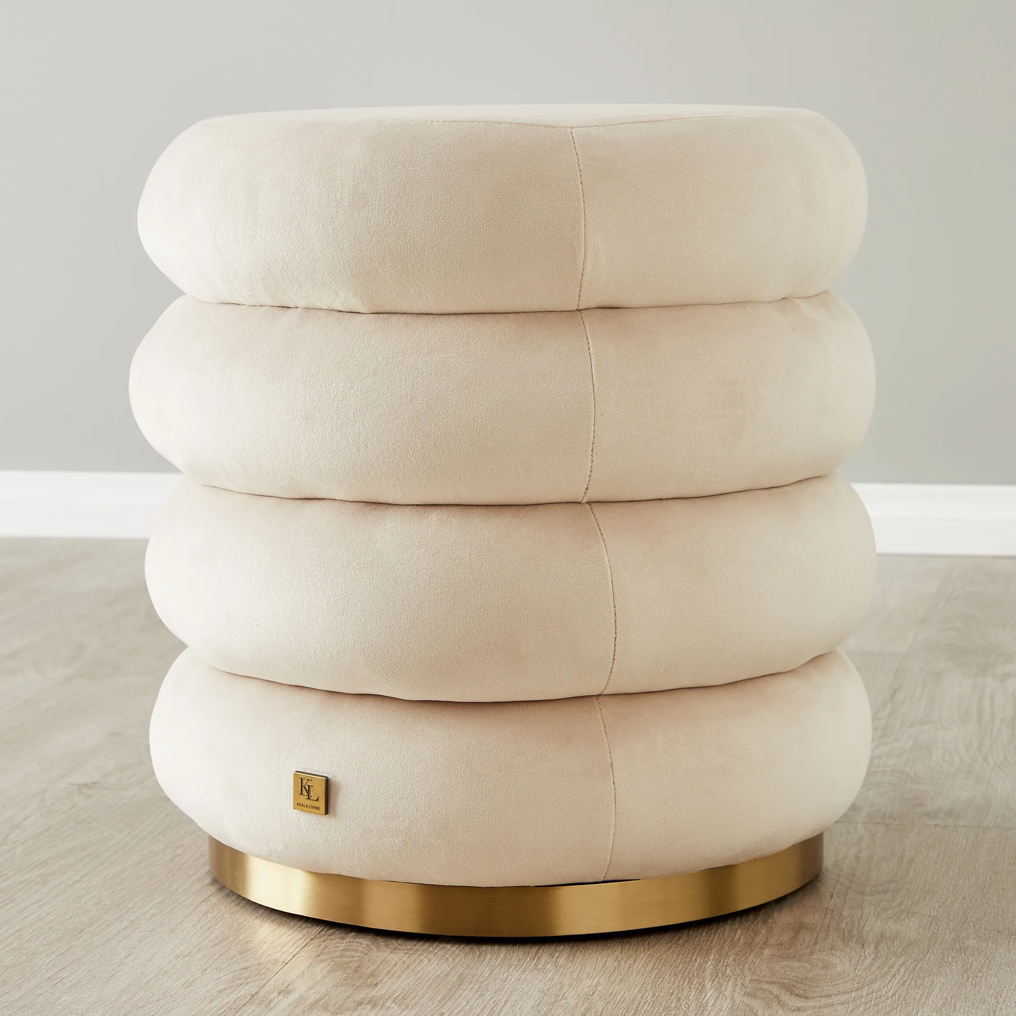 The Megan Cream Velvet Ottoman exudes a contemporary charm with its layered, rounded form that offers a modern twist on classic luxury. Each tier of plush velvet invites a touch, layered like a sumptuous cake, and the cream coloured hue adds an on-trend, yet timeless, appeal that can complement a variety of palettes. This ottoman's style is crowned by a lustrous, brass-colored band that encircles its base, providing a chic metallic contrast that truly makes the piece pop.