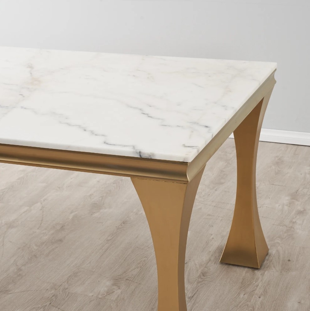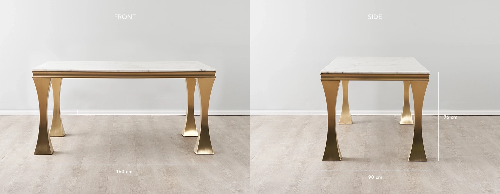 Providing stability and balance to the Melody is a symphony of stainless steel legs. These have been meticulously crafted to form a concave design which further adds to the Melody's sophisticated aesthetics. The matching of white marble with the champagne gold-coloured frame creates an undeniably luxurious look. Pair the Melody with an ensemble of our dining chairs.