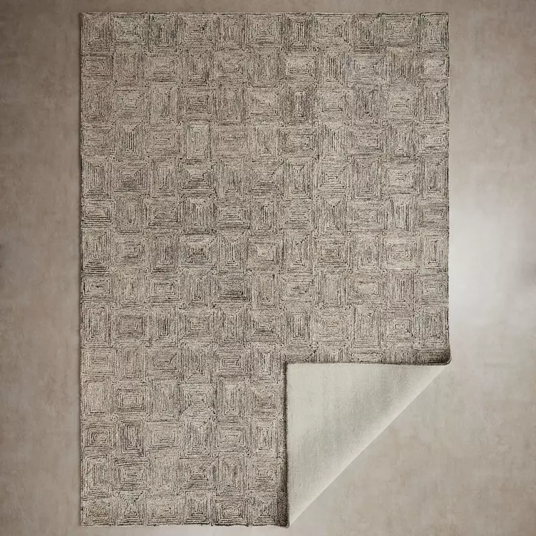 Its design consists of concentric squares, woven with shades of beige and brown, which bring warmth to any space.