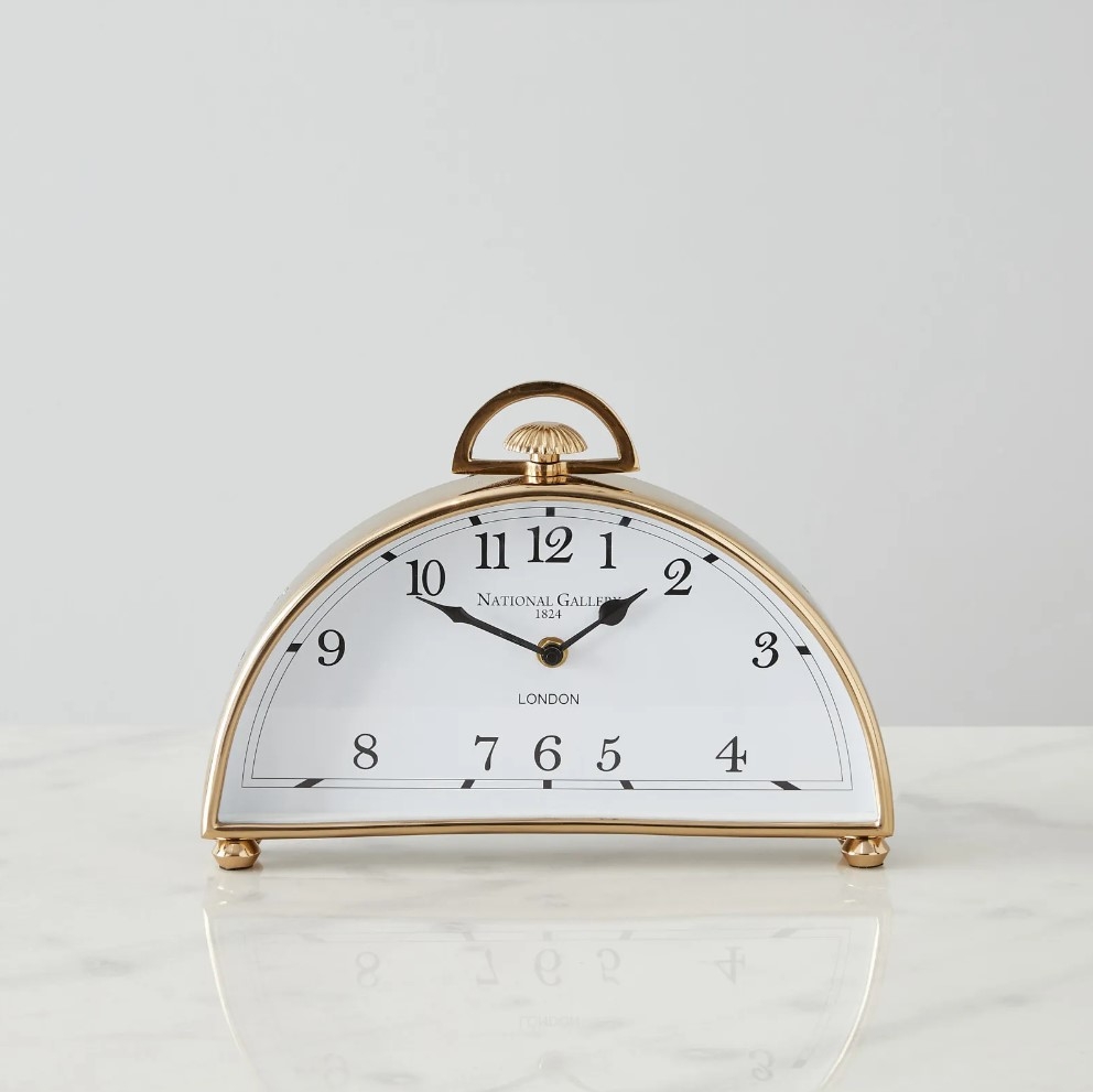 Introducing the Midnight Polished Gold Metal Clock, where the magic of its half-circular design delivers a complete panorama of luxury. This timepiece, with its gleaming polished gold metal body, casts a luminous aura, turning every fleeting second into a moment of lustrous wonder.