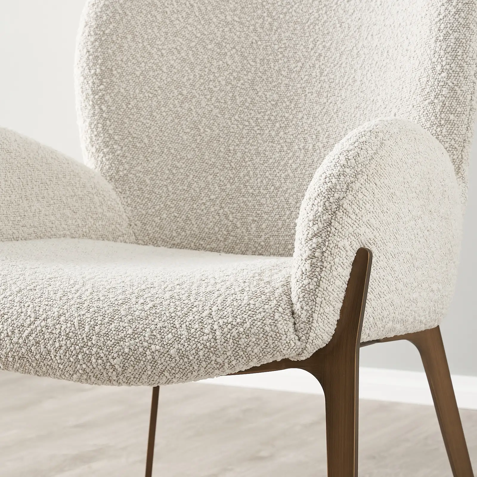 Enjoy modern dining with the Milana Snow White Boucle Dining Chair. Upholstered in snow white boucle and supported by sleek bronze legs, it exudes subtle elegance.