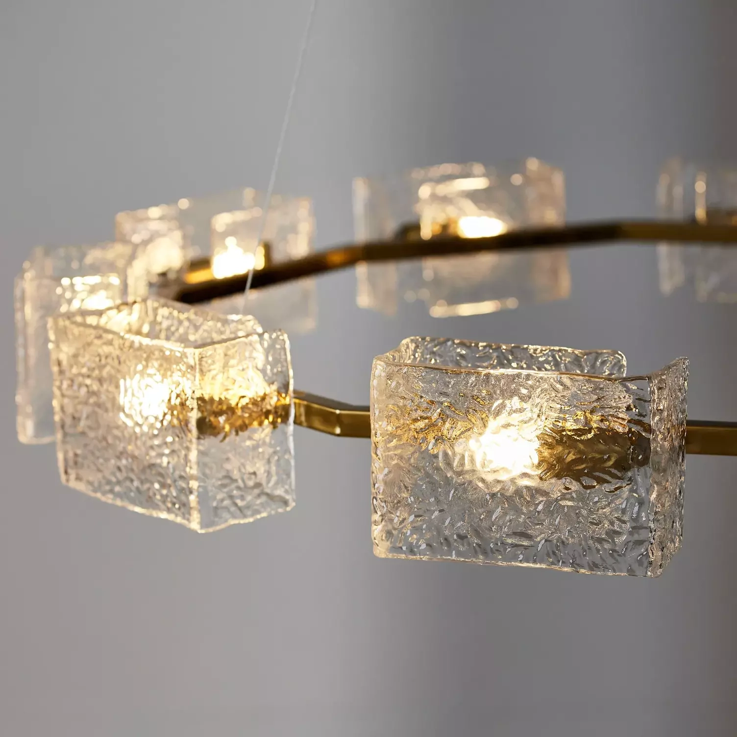 The Minda Brushed Gold Glass Chandelier showcases a crown of hammered glass, with each textured panel encasing a warm, glowing light.