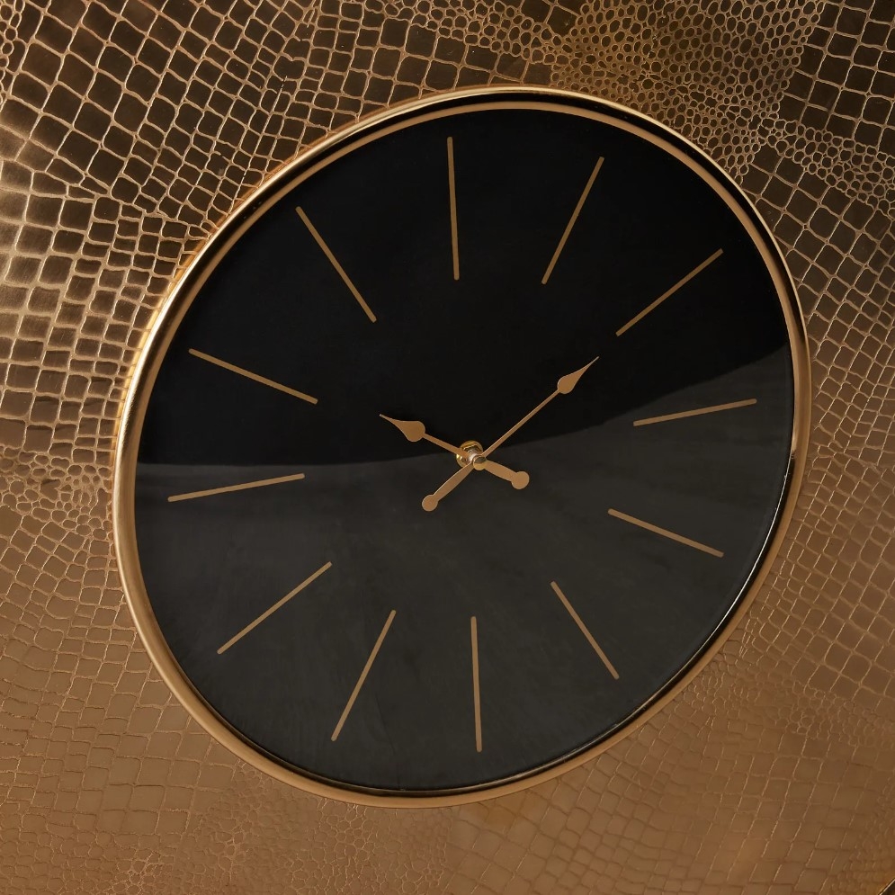 The all-black watch face is accentuated by gleaming golden details, creating a striking visual contrast. But the true highlight is the clock's outer border; the intricate croc pattern, set against the shimmering antique brass backdrop, adds an additional layer of sophistication. The Miriam doesn't just tell time - it narrates a tale of refined elegance.