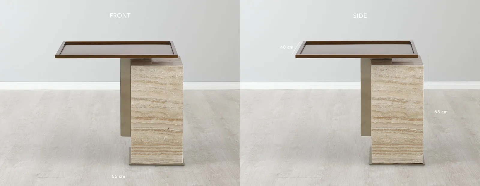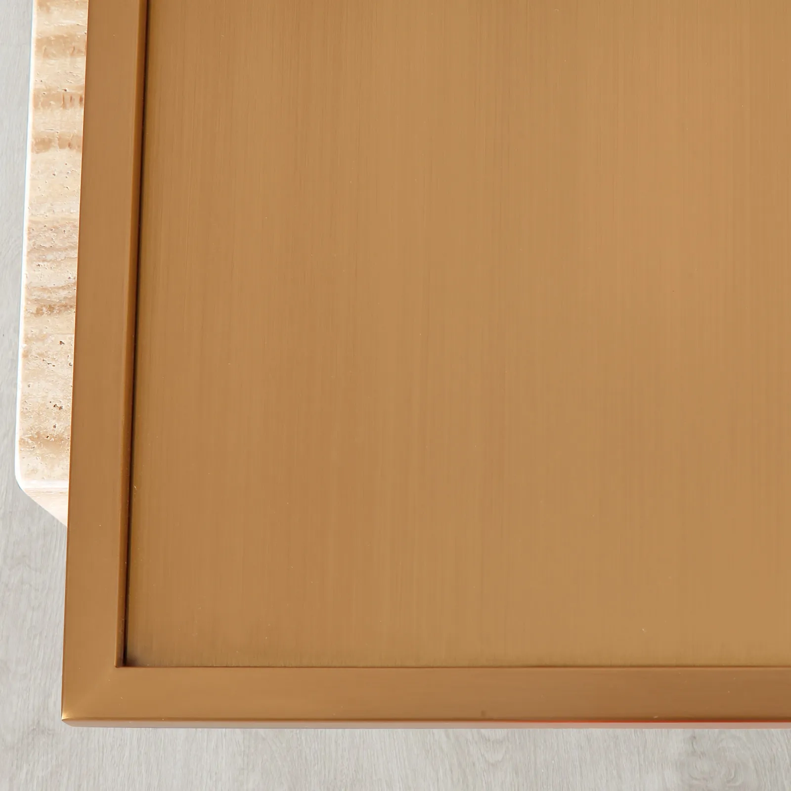 The side table features a sleek rectangular top, bordered by a thin brass trim that adds a touch of elegance and a modern contrast to the organic look of the travertine. The base's design is a thoughtful balance between the substantial presence of the stone and the refined finish of the metal, resulting in a piece that feels both grounded and sophisticated. With its clean lines and luxurious materials, the Monolith Natural Cream Travertine Side Table is more than just a surface to place your coffee cup; it's a statement piece that can anchor a room or add an understated opulence to a minimalist space.