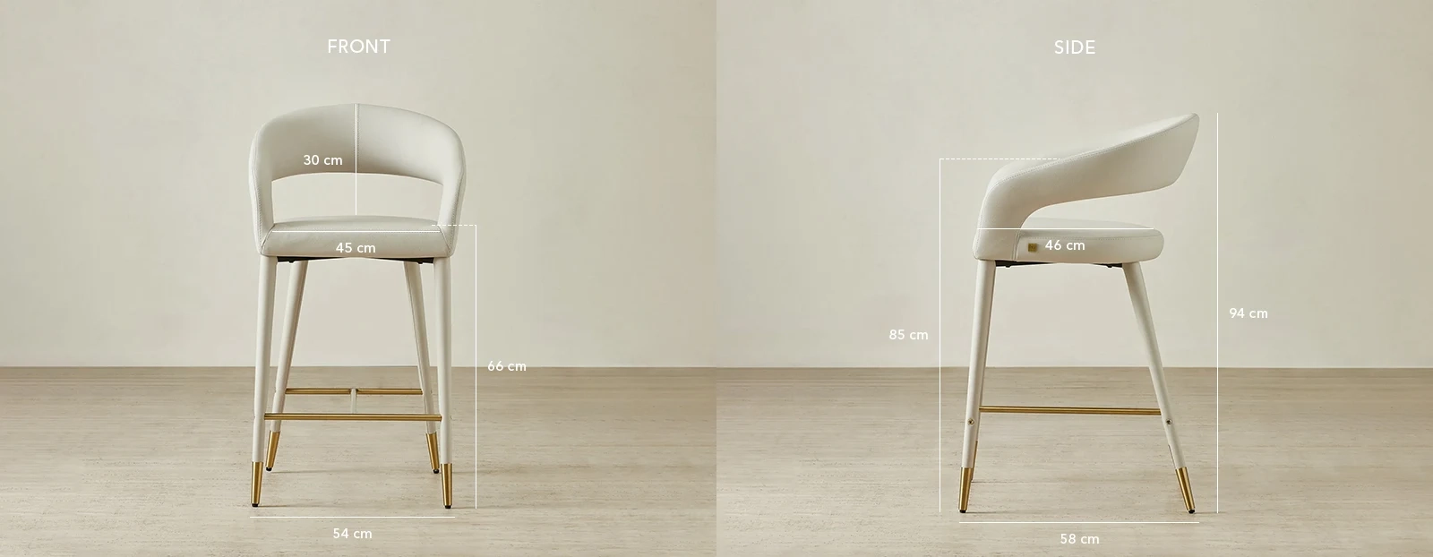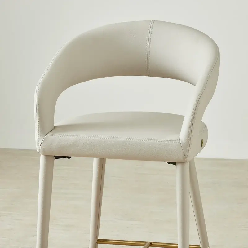 The Moulin Counter Stool brings refined style, upholstered in smooth glacier grey vegan leather for a sleek, modern look. Its mid-century inspired silhouette is defined by a graceful open back and slim angled legs in a champagne gold finish.