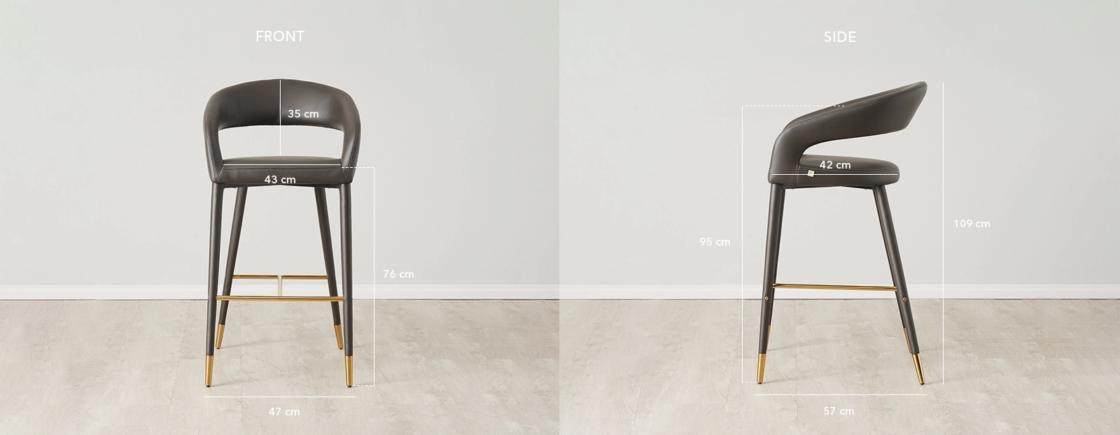 The open back facilitates great posture and reduces stress on the body. The slim backrest and seat are padded with dense foam, offering a comfortable lounging experience. It features a slim golden metal frame that joins at the legs and serves as a helpful footrest. Pair two Moulin chairs with one of our gorgeous bar tables for a truly exquisite home bar ensemble.