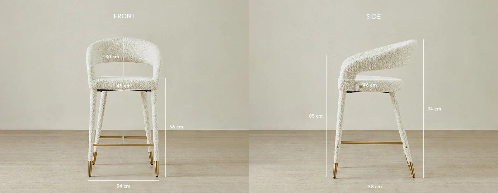 The Moulin Counter Stool offers understated elegance, upholstered in soft woven fabric in a versatile stone cream tone. Its mid-century inspired silhouette is defined by a graceful open back and slim angled legs in a champagne gold finish.