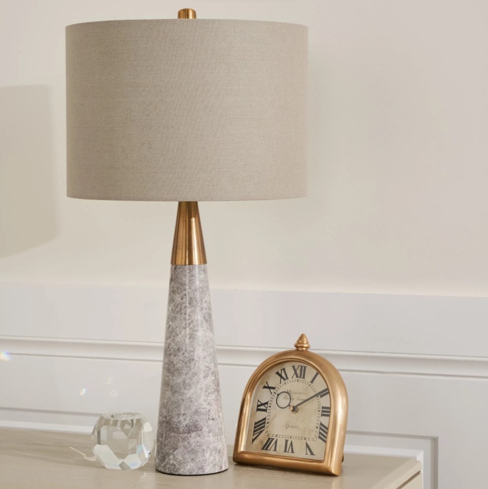 This earthen element is wonderfully juxtaposed with the lamp's upper section, a sleek column of brushed bronze-colored metal that adds a modern yet timeless flair. Encasing the lamp's glow is a grey linen shade, harmonizing with the marble and metal in an ensemble of exquisite materials.
