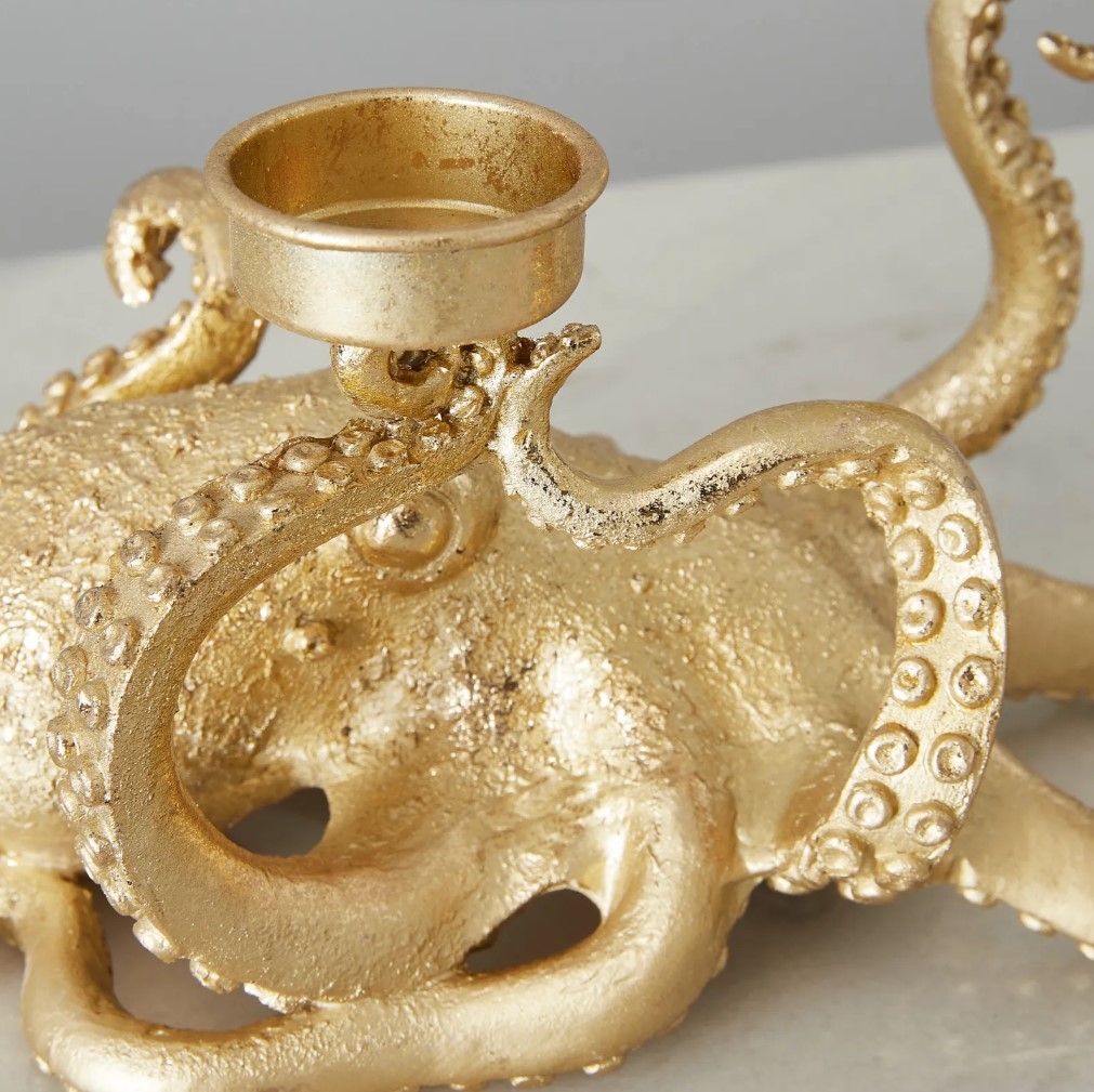 At the center of this masterpiece is the octopus, radiating an undeniable charm. Glistening in a rich gold hue, the resin casts a luxurious sheen that captures the essence of underwater marvels and brings them to the heart of your living space. But what truly sets this candleholder apart is its imaginative design. Three of the octopus's tentacles, gracefully curled and coiled, rise upwards to form unique candle holding platforms.