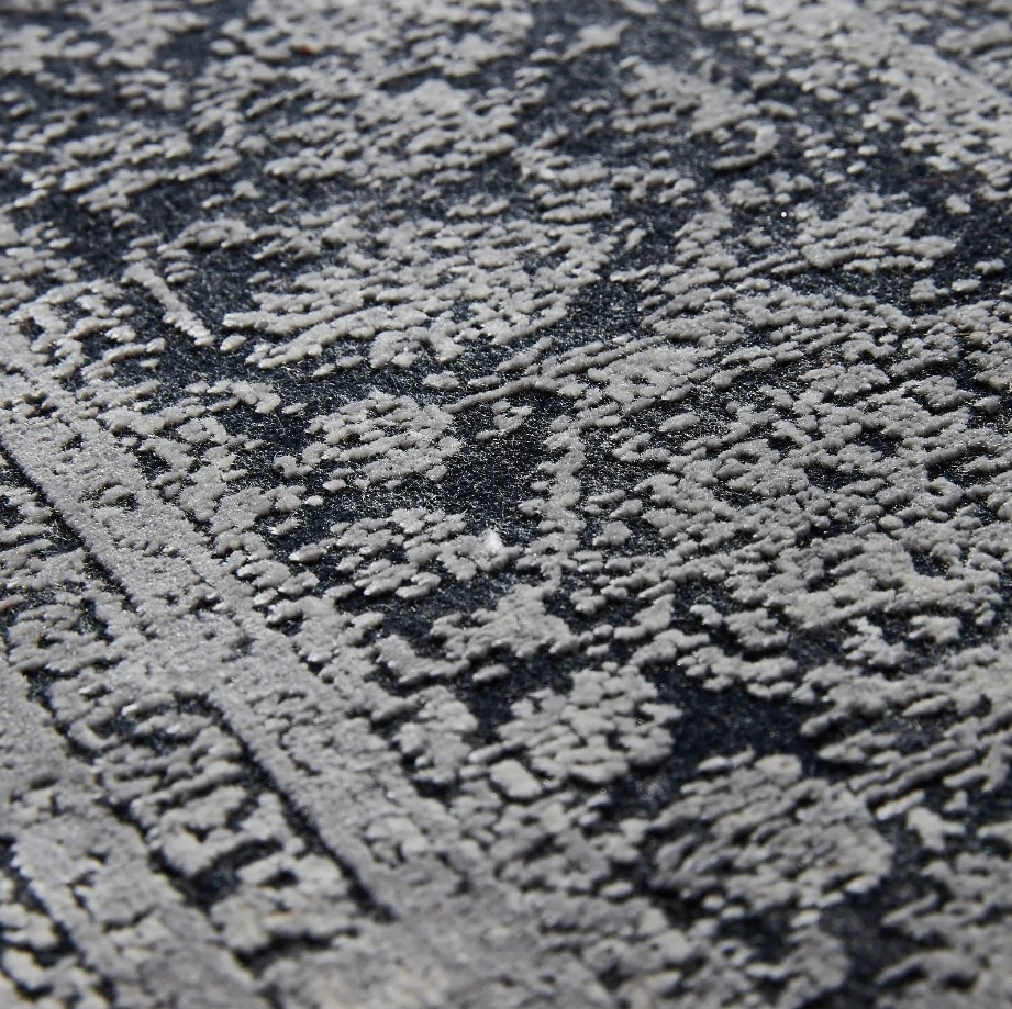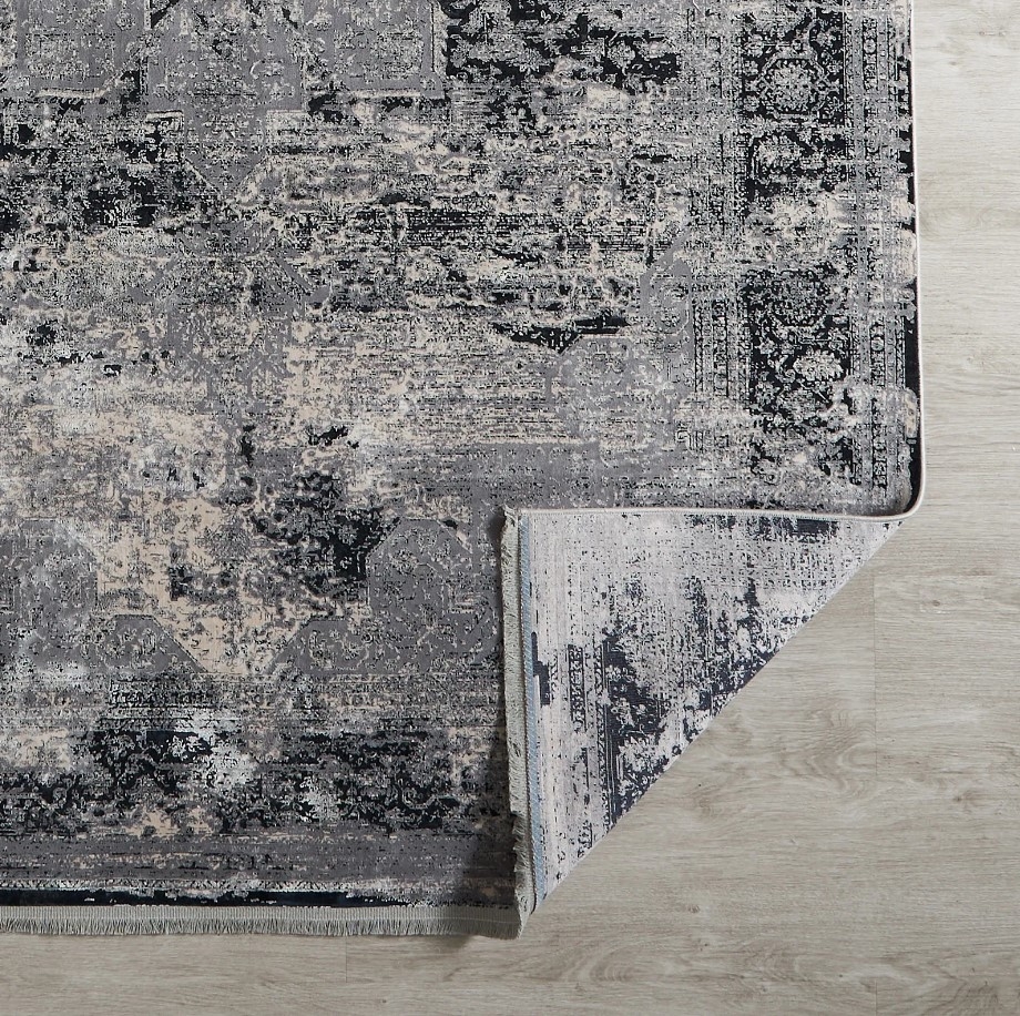 The Odette's sun-like medallion is a faded masterpiece, its presence on the rug like a secret waiting to be discovered. This central emblem, along with the ornate borders, is only fully appreciated upon closer inspection, where the interplay of white, black, and grey hues comes to life. The subtlety of these designs in the Odette Floor Rug plays with perception, encouraging a closer look to uncover the complexity hidden within its weathered appearance.