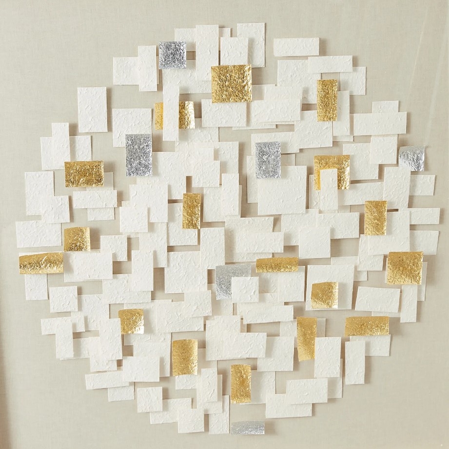 Predominantly white in color, the paper pieces evoke a sense of purity and infinity, with occasional strips in silver and gold adding a touch of opulence and warmth. The silver elements introduce a modern, sleek look to the piece, while the gold strips bring a classic, timeless quality.